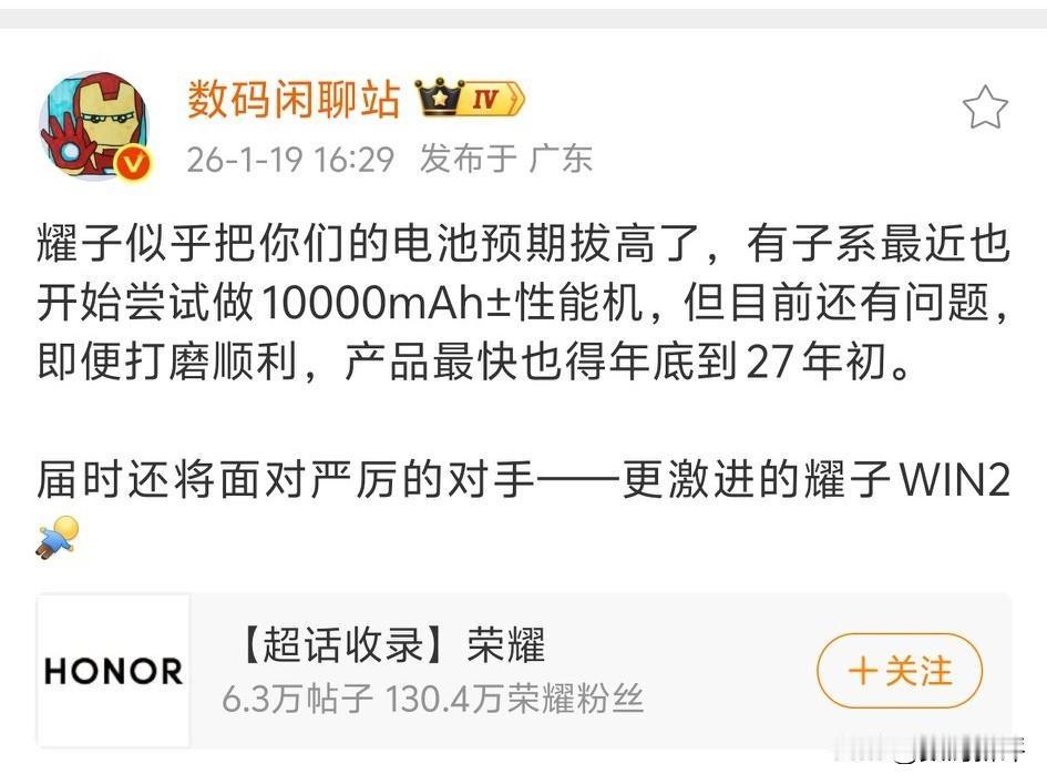 荣耀一万毫安电池性能机型要独占到27年初了[思考]有风扇还有高刷,目前绝对独一份,短期没有人可以追上来[捂脸]要么就是厚的和板砖一样,等友商发布了,荣耀win2系列都要来了,等友商9K毫安性能机普及,荣耀win系列又降价了,有价格优势 所以怎么看都还是荣耀更胜一筹啊[笑哭]不过即使一万毫安电池机型也得好好优化