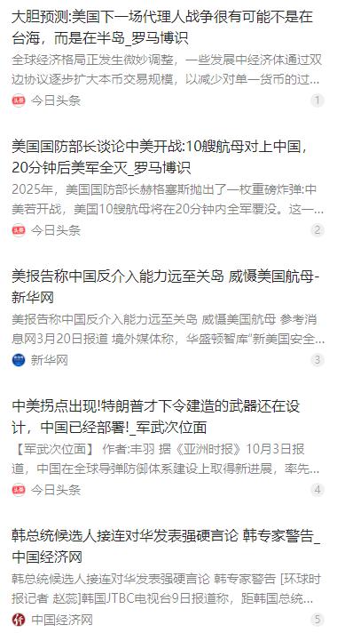 韩国军事专家:就算美国调动11艘航母,调派所有军队,都派往中国发动进攻,最后的结果也只有一个,那就是美国彻底失败!现在已经不是以前的时代了,美国只能通过韩国日本作为代理人,来间接进行战争!这番表态在国际舆论场引发热议,有人觉得这是夸大其词的言论,但深入梳理当前的军事格局和地缘态势就会发现,这番言论并非空穴来风。 麻烦看官老爷们右上角点击一下“关注”,既方便您进行讨论和分享,又能给您带来更多优质的内容,感谢您的支持! 21 世纪的国际军事竞争,早就脱离了单纯比拼航母数量、军队规模的老旧模式。现代战争拼的是体系对抗,反介入、区域拒止能力成为决定胜负的关键,而这正是中国的优势领域。 中国发展的反舰导弹与各类作战平台相结合,已形成超过 600 海里、远至关岛的反介入能力,美军航母在中国周边近海作战环境中,生存性和有效性正面临严峻挑战。 被称为 “航母杀手” 的东风 21D、东风 26 等反舰弹道导弹,再加上空射鹰击 12 导弹等装备,构成了多层次的反舰体系,让美军航母难以 “安然无恙” 地靠近中国周边海域。 美国国会下属的美中经济与安全审查委员会也曾发布报告,明确指出中国持续强化的反介入 / 区域拒止能力,正在有效吓阻或推迟美国对地区冲突的军事反应。 除了体系对抗的差距,现代战争更是工业体系与战争持续力的终极较量,这一点上中美两国的差距同样明显。 美国军工体系如今深陷政治博弈和预算纠葛,项目论证周期漫长,跨部门协调复杂,规模化生产和快速补充能力严重不足,往往是提出先进概念容易,落地量产却困难重重。 反观中国,不仅拥有全球最完整的工业体系,科研、军方与产业界的一体化程度还极高,能迅速将技术方案转化为实际装备并形成战斗力。 从造舰速度到导弹生产,中国军工的产能和效率已全面超越美国,在长期高强度冲突中,这种工业优势能转化为极强的战争韧性,保障装备和物资的持续供应。 韩国专家的判断,其实点破了一个关键现实:美国早已没有独立发动对中国这样大国正面战争的底气,只能通过盟友分担风险。 这背后,是中美力量对比发生的结构性变化。曾经美国在军事、科技等领域的绝对优势正在逐渐缩小,中国的综合国力和国防实力稳步提升,已具备与美国展开对等博弈的能力。 同时,这番言论也反映出部分东亚国家的清醒认知:在大国博弈的棋局中,成为冲突前线绝非好事,反而会面临巨大的安全风险。 近年来,美国主导的印太战略框架不断强化,盟友间的军事协作持续升级,日本 2025 财年国防支出已升至 8.7 万亿日元,重点投入远程打击装备和无人系统,从岛链防御向区域威慑转型。 日本的 F-35B 隐身机队已达 140 架,还采购了战斧巡航导弹,总射程超 2500 公里,再加上宙斯盾系统的支撑,能形成覆盖广泛的作战网络,其军工自给率也从上世纪的 30% 提升至 75%。 韩国则推进本土导弹项目,玄武 - 4、玄武 - 5 型地对地导弹相继部署,射程扩展至 800 公里以上,精度误差小于 10 米,同时整合美制爱国者系统,形成了多层拦截的防御网。 2025 年,日韩还签署联合军售协议,共享导弹技术,日本提供巡航导弹组件,韩国贡献固体燃料技术,从情报交换推进至联合研发,形成了互补的军事协作链条。 美国之所以选择借力日韩,本质上是在规避直接冲突的高风险。2025 年美国智库的模拟评估显示,若在台海地区与中国发生直接冲突,美军可能损失 20 艘以上主力舰艇,补给线拉长数千海里,损失率高达 30%。 而借助半岛的地缘优势,通过日韩展开代理人行动,能将干预成本降低约 40%,损失率控制在 15% 左右,这种低风险、可控的模式,自然成为美国的优先选择。 但即便是代理人模式,美国也未必能如愿。韩国专家的言论,其实也暗含着对自身处境的担忧 —— 一旦成为大国博弈的棋子,东亚国家随时可能被卷入冲突的漩涡。 中国始终坚持和平发展,不愿与任何国家发生军事冲突,但这并不意味着中国会放弃核心利益。完善国防力量,正是为了遏制战争、守护和平。 如今的国际格局,早已不是某一个国家可以独断专行的时代。中美作为世界大国,合则两利、斗则俱伤,通过对话协商化解分歧,才是符合全人类利益的正确选择。 美国若执意抱着冷战思维,试图通过代理人战争遏制中国发展,最终不仅难以达到目的,还可能让其盟友陷入险境,自身也会付出沉重代价。 韩国专家的言论,与其说是对军事力量的预判,不如说是对时代趋势的提醒:霸权主义早已行不通,顺应多极化潮流、尊重各国核心利益,才是避免冲突、实现共赢的正道。