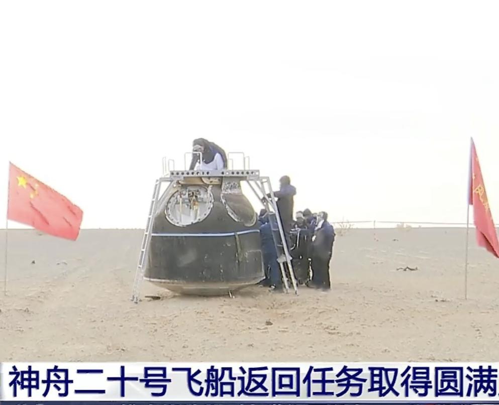 神舟二十号的成功返回的几个细节: 1、返回舱平稳落地,呈站立姿态。 2、出现