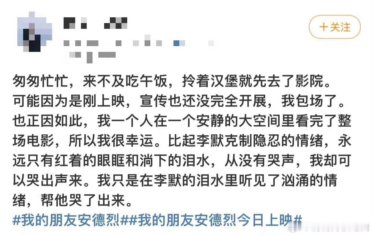 幸好是我一个人包场看安德烈谁懂啊!包场看这部真的选对了,哭到纸巾用了半包。走出