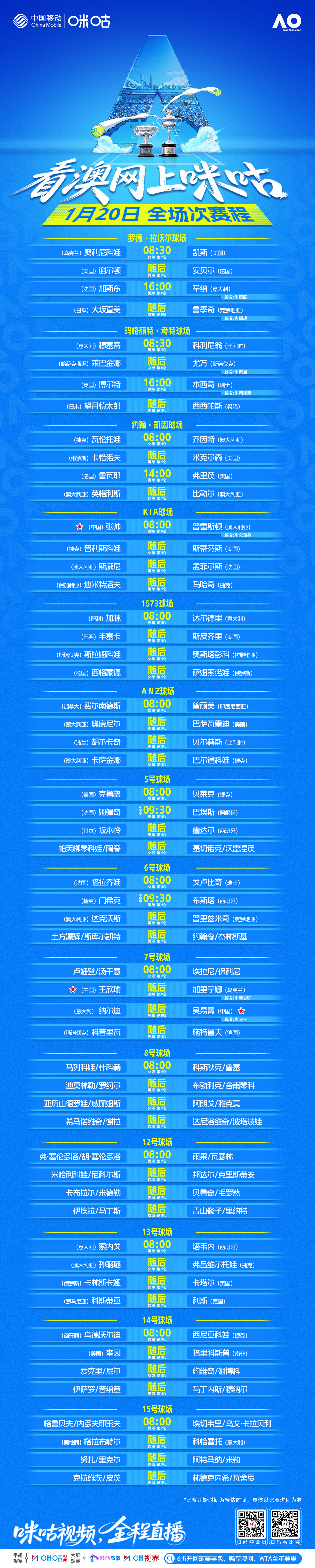 #上咪咕看澳网#1月20日赛程🐟 王欣瑜2026澳网初亮相♟️ 吴易昺初次交手纳尔迪🍄 1月20日8:00起 咪咕视频直播👉 网页链接