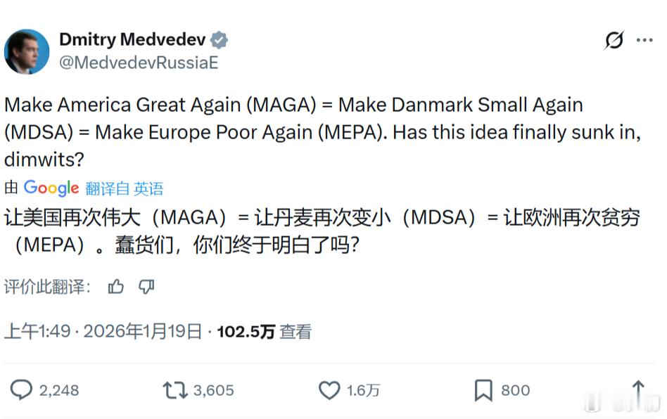 梅德韦杰夫:让美国再次伟大(MAGA)= 让丹麦再次变小(MDSA)= 让欧洲再次贫穷(MEPA)。蠢货们,你们终于明白了吗?“姐夫”的嘴还是一如既往的笋。
