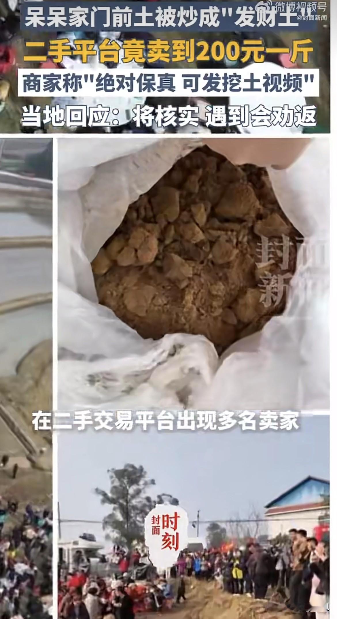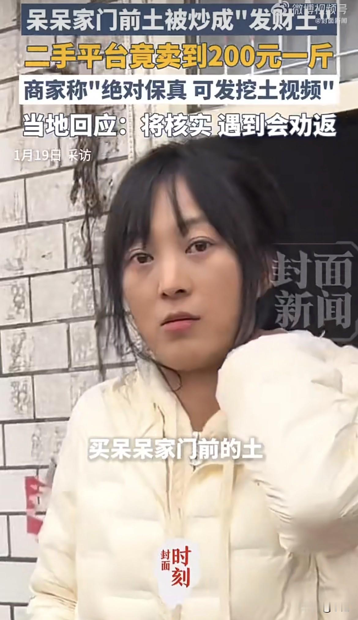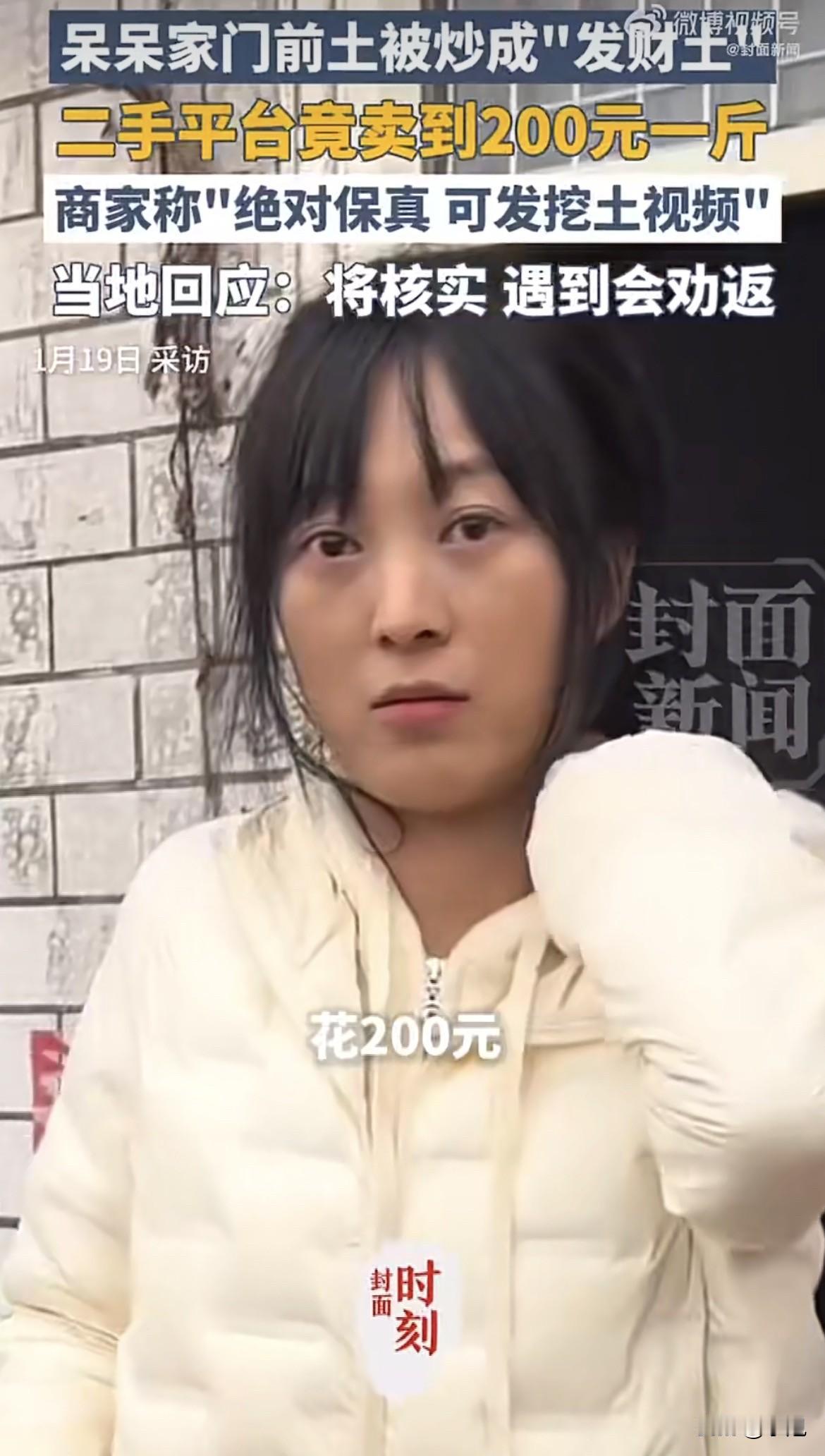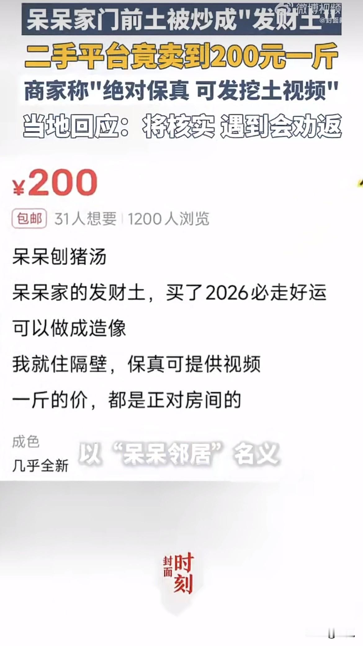 离谱!呆呆家门口的泥巴,在二手平台上卖到了200块钱一斤。 你没听错,就是普通的泥土,装在塑料袋里,标价66块6、166块,最高的敢要200块。卖家打出的名号是“呆呆家邻居”,商品介绍写得玄乎其玄,叫“发财土”、“转运土”,还说能保人“顺风顺水”。 有人去问,这土保真吗?合规吗?卖家回得底气十足:“合规的。我可以去现场挖,拍视频给你看。下午有几个人要,我一起去挖。” 这话听起来,挖土倒像是一场庄严的仪式。 这事能出来,全因为一个叫“呆呆”的重庆合川女孩。她前阵子发视频,说家里要杀年猪,父亲年纪大了按不住,就邀请网友来帮忙,按习俗招待大家喝“刨猪汤”。没想到这段充满乡土气的视频一下子火了,几千人从全国各地跑到她的小村子,一场家庭活动变成了需要村干部协调秩序的大型聚会。呆呆的粉丝量几天内从几百涨到超过百万。 热度一起来,各种意想不到的事就跟着来了。卖门口的泥土,算是最荒诞的一种。 平台那边接到了咨询。工作人员查了查,给的回应是,现有的社区公约里,没有明确禁止售卖泥土这类商品。村委会的人也知道了,说已经关注到,会去核实情况。 有懂行的人一看就明白,这和之前网上卖“银行土”是一个套路。都是把普通的泥土,包装成带有“招财”、“转运”神秘力量的商品。江苏消保委之前就明确说过,这种宣传涉及迷信内容,涉嫌违反《广告法》。珠海的市场监管部门也查处过类似的案子,在广告里说能“化解灾难”、“五鬼运财”,结果被认定违法罚了款。 所以,所谓“合规”的说辞,根本站不住脚。而且,如果真有人去人家门口挖土,还可能涉及破坏环境。 更让人担心的是背后的风险。这种交易,卖家往往要求拍视频“证明确实是呆呆家”,这本身就涉嫌侵扰他人的私人生活和居住安宁。有律师分析过类似的“银行土”交易,卖家有时会要求买家提供房屋格局、大门朝向这些信息,这里头就藏着个人信息泄露的风险。 热闹是网友凑的,但最后收拾残局的往往是自家人。杀猪宴结束后,有人就看到呆呆的母亲一个人在默默打扫满地的狼藉。现在,连她家地上的土都被人惦记着要挖走卖钱,这份突如其来的“流量”,对一个普通家庭来说,滋味可能真的很复杂。 你说,真会有人花两百块钱,去买一包不知道从哪儿来的泥巴吗?