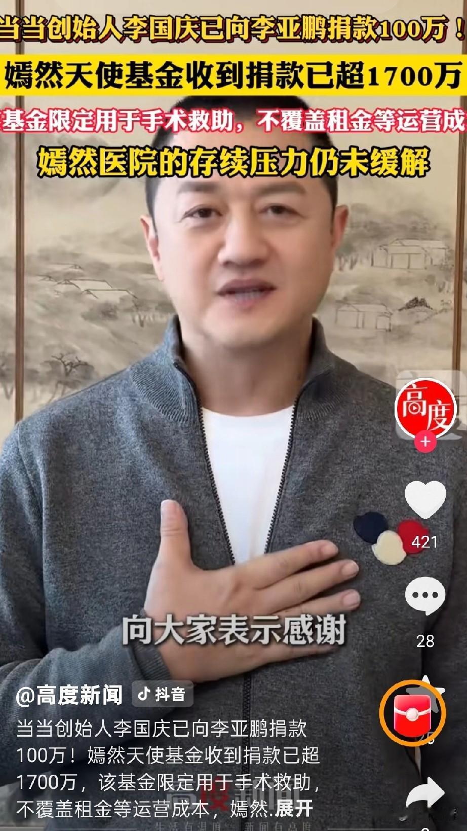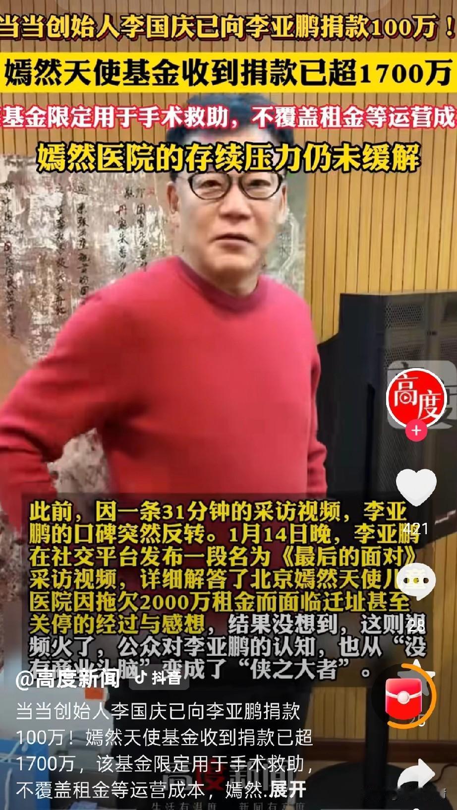 原来细节说明了李亚鹏真是个好人,一位妈妈讲述了自己儿子在嫣然天使医院做过唇鄂裂手术, 居然没有花1分钱,当时只花了10块钱买了个苹果,她自己都不敢相信这居然是真的, 而且他自己还欠房东270万,因为他以个人的名义北京儿童医院做了担保,嫣然儿童医院欠的房租300万,他自己要承担连带责任270万! 如今嫣然天使基金会已经收到网友捐款1700万,但是嫣然天使基金会的钱是专款专用,只负责给医院做手术使用,并不能完全覆盖医院的房租及开支! 幸运的是当当网创始人已经给李岳鹏捐了100万,并且还晒出了捐款的记录,这样当当网的创始人李国庆再次回到了公众的视野! 可以说他这100万花的非常值,当当网作为一个专门卖书的网站,实际上已经落寞了,如今的李国庆也是靠直播带货再次起飞! 这次给李亚鹏捐款,也给他添加了正面形象,而且让很多网友重新认识了李国庆!所以说,双方算是各取所需! 这100万对李亚鹏来说是雪中送炭,欠了李国庆一个人情。李亚鹏虽说做生意不行,但是人品没得说,人脉资源极广! 对于有钱人来说,钱不是问题,主要就是背后的资源,相信以后李国庆会有用得着的地方, 大家对于李亚鹏如今的处境怎么看?不妨聊一聊! 李亚鹏 嫣然儿童医院 李亚鹏女儿 嫣然天使公益