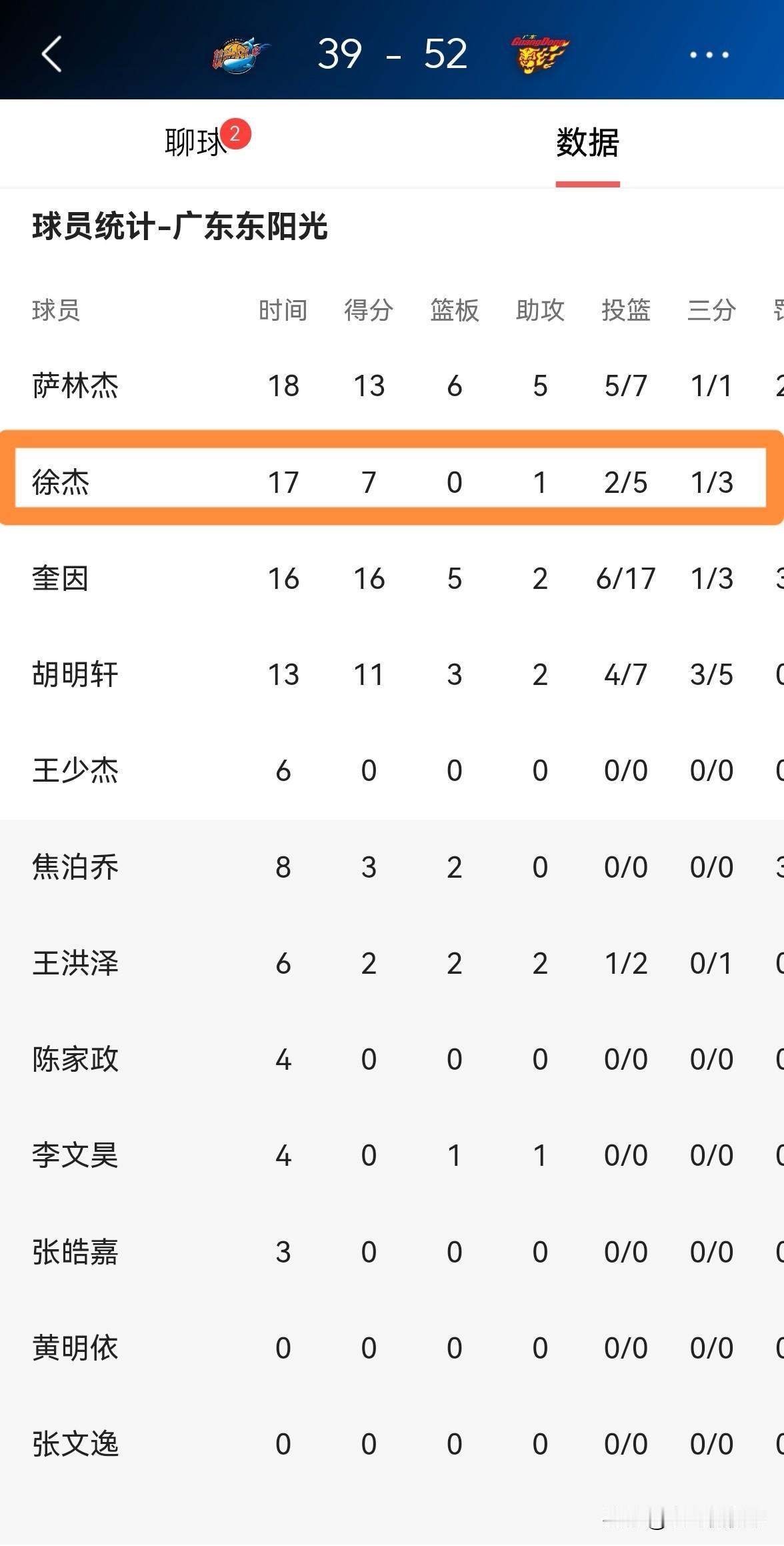 广东东阳光超级球星徐杰真是一名斗士!在今天广东东阳光客场挑战四川丰谷酒业的比赛中,目前双方半场战罢,广东东阳光以52:39领先对手。在前两节比赛中,带病出战的徐杰首发出战17分钟,投篮5中2,其中三分球3中1、罚球2中2得到7分1助攻,他的场上正负值为全队第二高的+19。 虽然徐杰在场上仍然有咳嗽的症状出现,但是他依然在攻防两端拼尽全力,展现出了超强的拼搏精神,让我们为徐杰的敬业精神点赞吧。