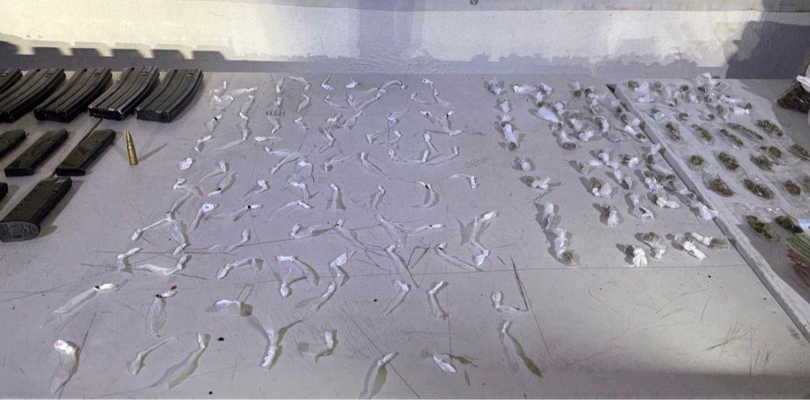 2026年1月17日发生在锡那罗亚州库利亚坎阿瓜鲁托监狱的一次突袭行动。当局在行动中缴获了117,123比索现金、一枚破片手榴弹、五支装有弹匣的枪支、超过1.3公斤分装在不同包装袋中的大麻和可卡因、27部手机以及其他物品,凸显了墨西哥监狱内贩毒集团活动的猖獗。 随附的图片展示了这些违禁品:第一张图片显示,在一面州安全部门的横幅下方的桌子上摆放着27部智能手机、刀具、手铐、对讲机和一些小袋子;第二张图片则显示地上散落着黑色步枪弹匣、一颗子弹和许多用白色纸包着的小包毒品。 作者Eco1_LVM运用讽刺的语言,将囚犯称为“租户”,称他们的“权利”受到了侵犯,并将该监狱戏称为墨西哥“装备最齐全的监狱”(“penacho”一词可能暗指贩毒集团头目“矮子”古兹曼在监狱里精心布置的奢华设施),以此来批判锡那罗亚州惩教系统的系统性腐败。