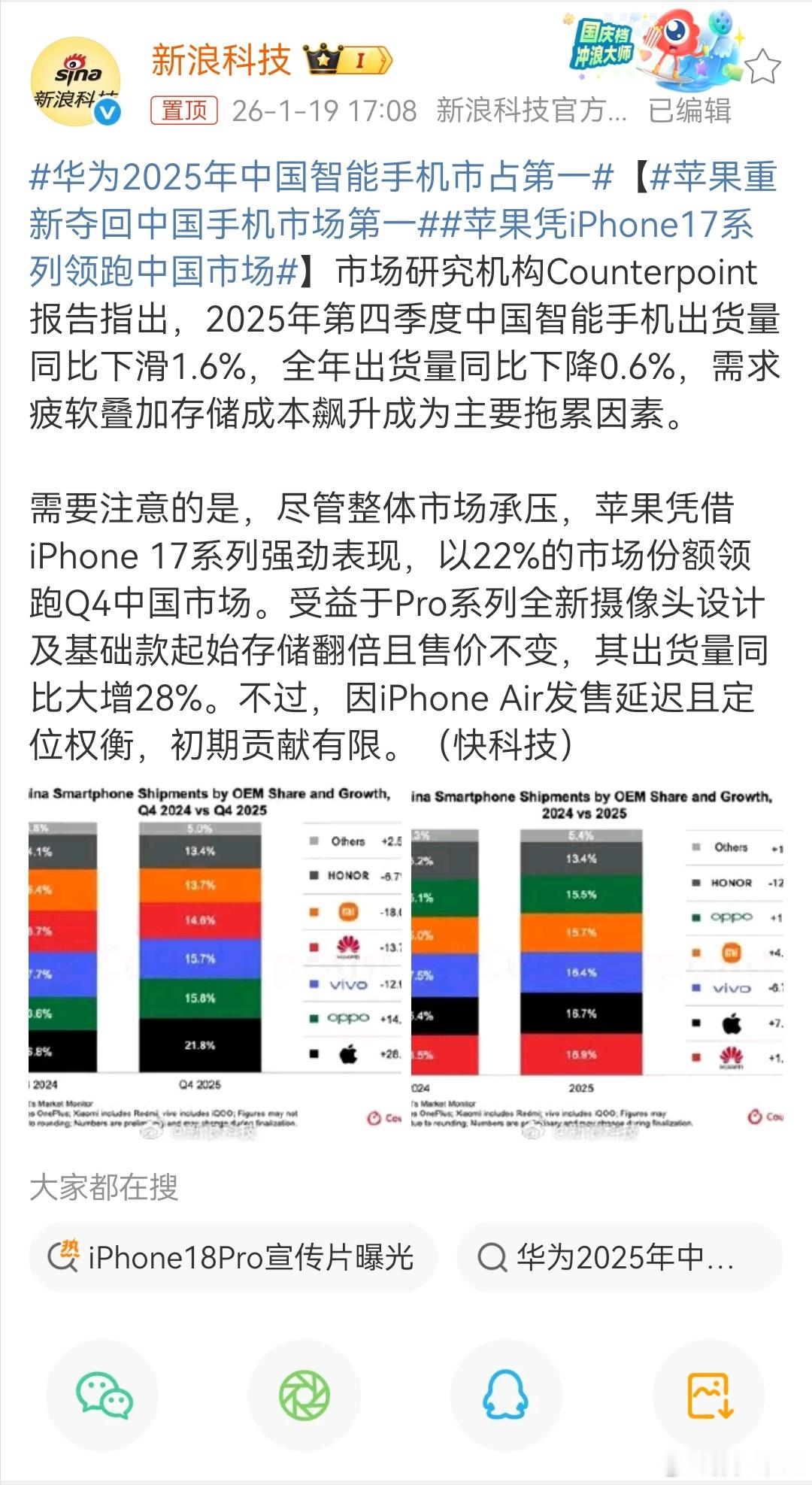 尽管整体市场承压,苹果凭借iPhone 17系列强劲表现,以22%的市场份额领跑Q4中国市场。这一代苹果17买的人真多,路上经常看见那个橘色外壳华为2025年中国智能手机市占第一苹果重新夺回中国手机市场第一苹果凭iPhone17系列领跑中国市场