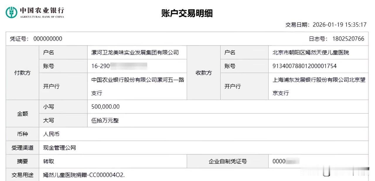 最新消息:目前支持嫣然天使儿童医院并捐款的企业有两家。 一家是豪士(福建)食品有限公司,捐款数目是30万人民币。另一家是漯河卫龙美味实业发展有限公司,捐款数目是50万人民币。 一家是生产面包的企业,一家是生产辣条的企业。我决定以后家里的面包和辣条就选这两家公司了,别的都不选。企业有爱心,作为普通老百姓的我必须用实际行动来支持。 (图片来源网络)