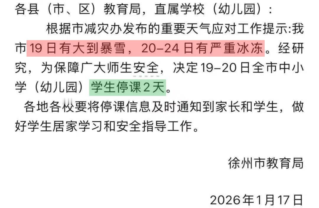 徐州停课是对的,太冷了!连续四天低于零下7度! 今天一早,南通下了一些小雨,不大,不影响早起的家长们送孩子上学,但气温是真的低,很多孩子都带上了帽子、围巾,包裹的严严实实。 单位的工作群里,南京的小伙伴发来了照片,南京一早飘了一些雪珠,但由于也夹杂着小雨,雪并没有积起来,不过风有些大,气温明显降低了。 徐州的朋友告诉我,那边下了不小的雪,道路上又明显的积雪,加上气温低,很多地方都冻起来了,有很多网友都拍到有行人骑电瓶车摔倒的照片。 看了徐州的天气预报,感觉徐州的学校停课是明智的,这周真的太冷了,连续4天,最低温度都在零下7度以下,加上雨雪天气,还是安全第一! 傍晚的时候,南通也发布了最新的信息,明天南通也将有不少的道路会面临冰雪冻住的危险,希望早起的各位,一定要注意安全!