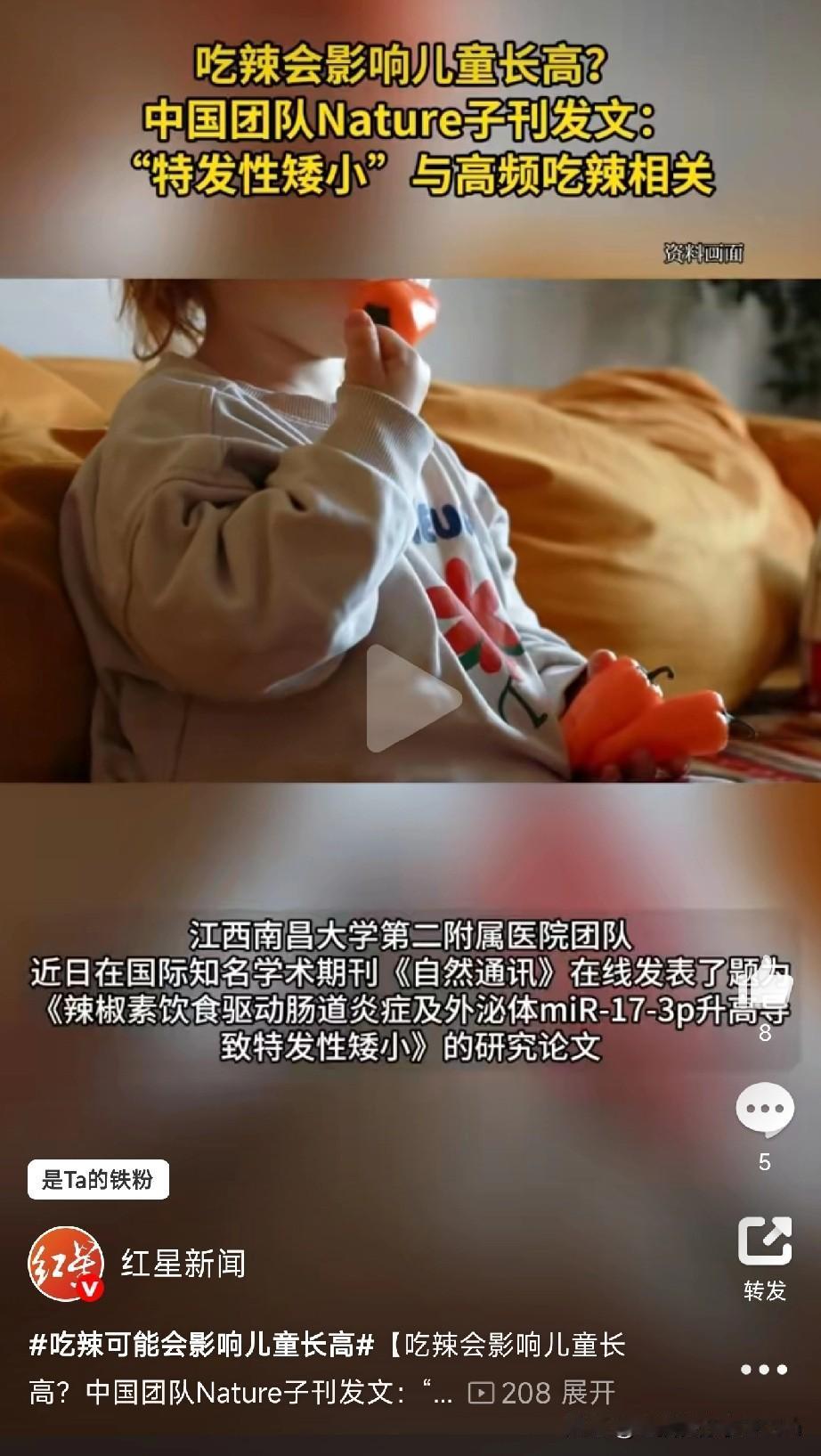 吃辣竟影响孩子长高? 爱吃辣的朋友警惕!江西南昌大学团队在《自然通讯》重磅发文:长期吃辣可能让孩子长不高!尤其是“特发性矮小”娃,辣椒素竟是“隐形杀手”! 研究发现: 原来,长期高辣饮食(比如辣条、火锅、辣椒酱)会悄悄引发孩子肠道“微炎症”!别小看这“隐形炎症”,它会释放一种叫miR-17-3p的“坏分子”,像“信号阻断器”一样,专门抑制骨骼生长的关键信号! 科学家用老鼠做实验,发现吃辣的老鼠虽然体重正常,但身高增长明显落后!显微镜下看,长高的“发动机”——生长板软骨细胞直接“罢工”了! 为啥生长激素治疗不管用? 因为辣椒素搞鬼!它让细胞对生长激素“不敏感”,就像耳朵被堵住了,补再多激素也白搭! 建议娃长个期,少吃重辣!辣条、火锅、辣椒酱悠着点,别让肠道天天“闹脾气”~ 关注“特发性矮小”娃:如果孩子体检正常但身高停滞,排查一下饮食是否太辣! 科学喂养:多补优质蛋白(如鱼肉)、钙和锌,少给娃吃高油高糖的“长高拦路虎”! 研究分析106例矮小患儿,发现吃辣频率与身高负相关!西南吃辣重灾区,发病率更高! 转发提醒身边家长!孩子的身高,可能就藏在每一顿餐桌上! (文章素材来自红星新闻,侵删)