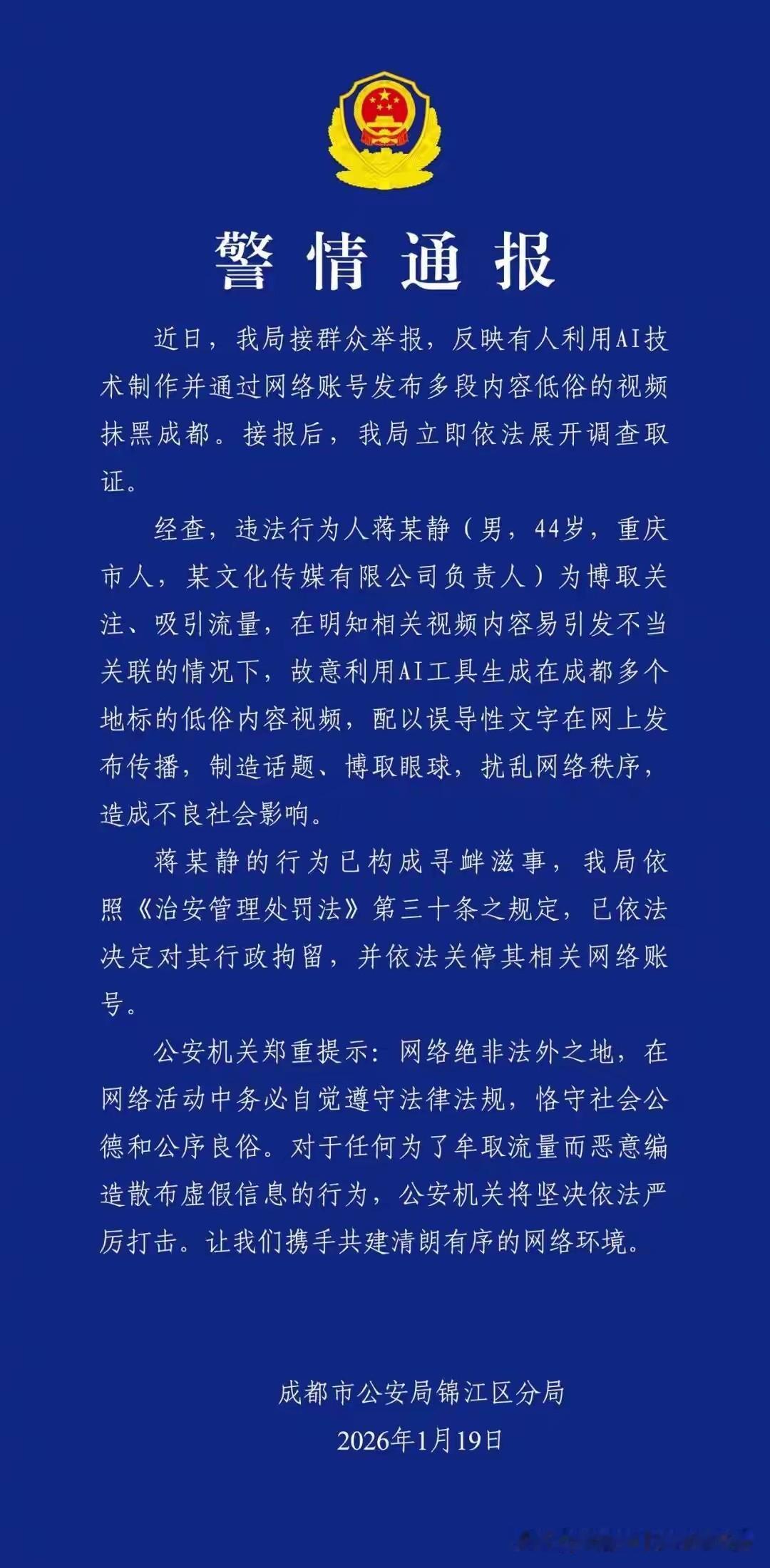 警方通报,为博取流量,利用AI工具生成在成都多个地标的低俗视频并配误导文字传播,已被行政拘留。 行动背景:此案是全国性整治行动的一部分。国家正开展“清朗·整治AI技术滥用”专项行动,重点打击利用AI制作谣言、低俗内容等行为。此前,成都网信部门已处置30余个污名化城市的账号。 深层问题:这暴露了AI技术被流量黑产滥用的乱象。违法者利用AI高效生成吸引眼球的内容,刻意关联地域以煽动对立,破坏网络秩序与城市形象。 治理方向:需法律、技术、公众教育三管齐下。明确AI内容法律责任,提升平台检测能力,同时培养网民辨别虚假信息的能力,共同维护清朗网络空间。ai编造谣言 AI虚假内容 AI乱象 AI技术危害 AI反谣言 AI直播乱象 低俗AI 成都ai课程 AI谣言 AI编造 AI版权风险 AI技术规范 成都ai 成都AI产业 AI乱象治理 四川ai 你遭遇过AI生成的虚假信息吗 AI的恶意是否可控 AI创作探讨