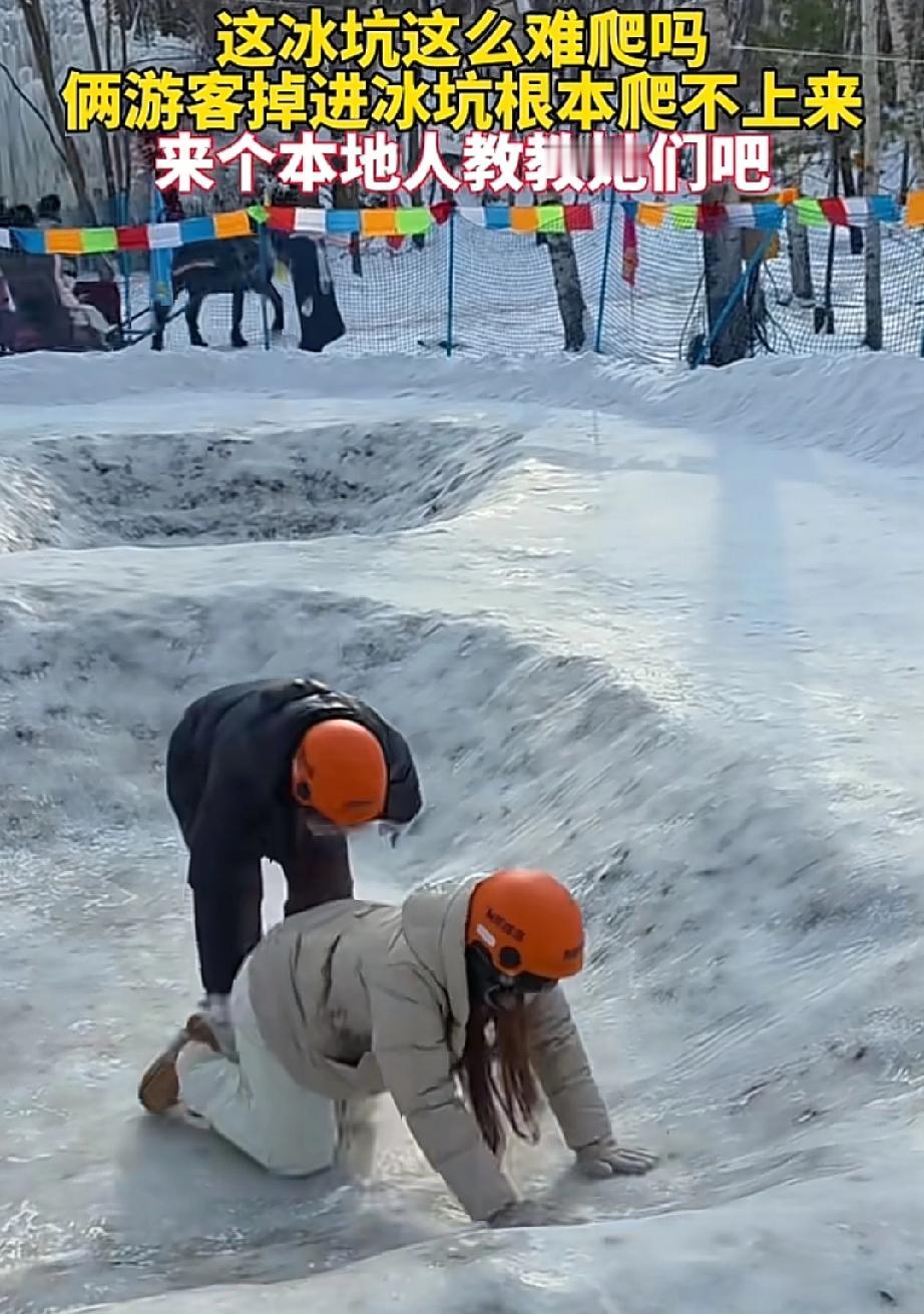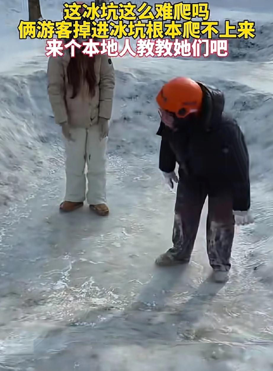 笑死了!两个南方来的女生在东北景区玩,看见一个结冰的坑,本地同伴赶紧劝:“别下去!下去就上不来!”可她们偏不信,结果真被卡在冰坑里动弹不得,最后还是靠别人帮忙才脱身。网友纷纷评论:这就是不听“老人言”啊! 这个冰坑看起来不深,大概也就到成年人大腿的位置,像是以前取冰留下的。一个本地姑娘一看就直摇头,连忙劝阻。 可两位南方女生满脸写着“不相信”——这么浅的坑,还能困住人?她们戴上头盔,手一撑、腿一跨,干脆利落地跳了下去。 结果,一下去就傻眼了!坑底是弧形的,滑溜溜的根本站不稳。她们想爬上来,可坑壁全是冰,手没地方抓,脚没地方蹬。 一个人用手肘扒住边缘,脚底却一直打滑;另一个想帮忙托一把,自己反而摔倒了。 两人在坑里折腾了半天,累得气喘吁吁,就是出不来。站在坑边的本地姑娘从一开始的担心,到后来实在憋不住笑出了声。 坑里的两人你看看我、我看看你,自己也忍不住笑了,场面又狼狈又好笑。 北方网友解释:“真不是体力问题!冰面光滑得跟镜子似的,没着力点,有劲也使不上啊!” 还有东北网友调侃:“我们从小就知道,这种冰坑看着浅,实际是‘坑人’的,本地人根本不会靠近。” 很多南方朋友没见过冰坑,觉得新鲜,想试试,这很正常。但这件事最让人感慨的是:有时候,我们最容易忽视的,恰恰是当地人用经验积累的“常识”。 就像北方人知道冰坑不能跳,南方人知道梅雨季衣服怎么晾一样,这些本地经验往往是书本上学不到的保命知识。 所以啊,到了陌生地方,对自然存一份敬畏,对当地人的提醒多一份虚心。旅游不只是看风景,更是学习如何与不同的环境相处。 听一句劝,可能就避免了一场麻烦。毕竟,出来玩,安全开心才是最重要的,你说对吧?