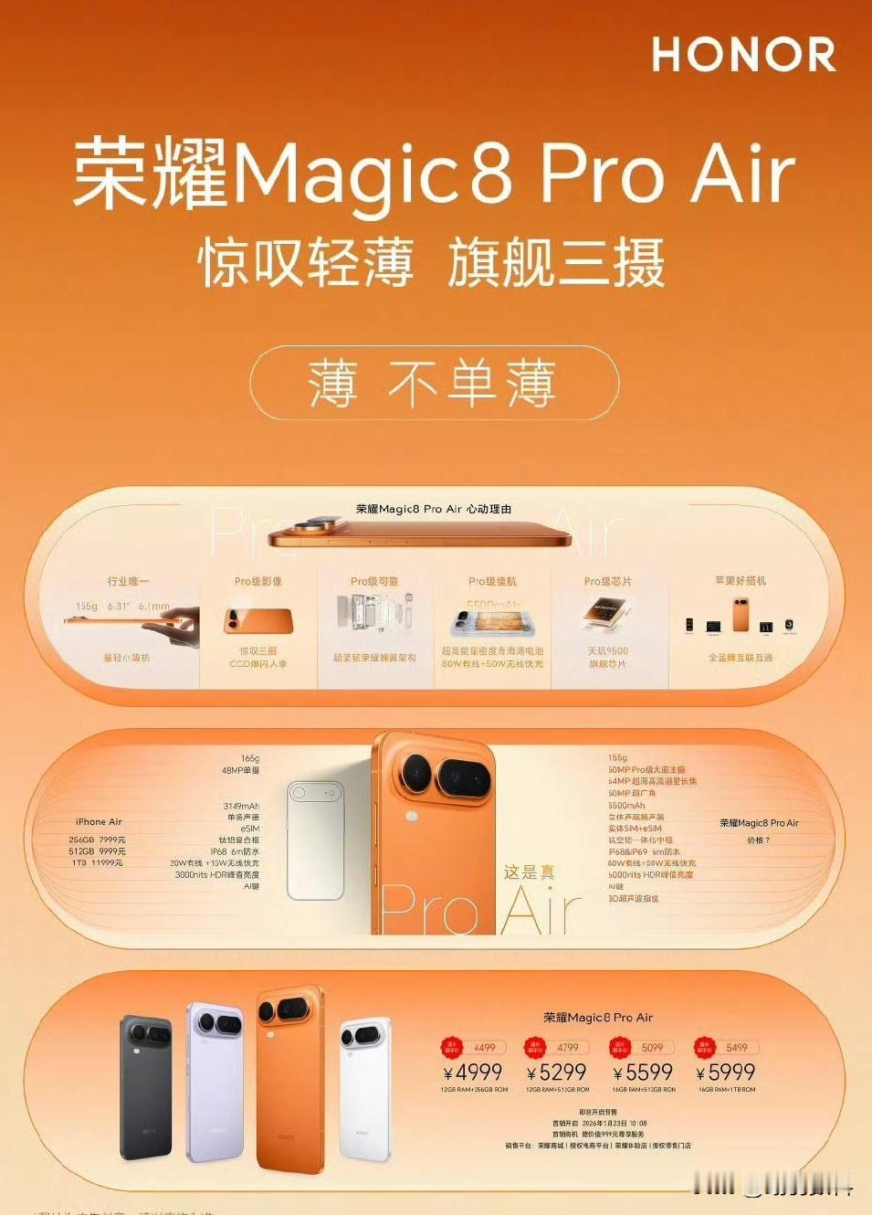 荣耀这款Pro且AI的手机 销量估计比较一般 虽说颜值不错 整体颜值皆佳 配置也较均衡 但命名蹭苹果Air之名 销量难有佳绩 其售价4999元起步 以荣耀品牌影响力 此价格难获高销量 但这款手机轻薄 兼顾配置均衡 颜值也十分出众 从设计看 原创度颇高 各大自媒体评测 也给出正面评价 虽希望荣耀手机销量上升 但性价比实在太弱