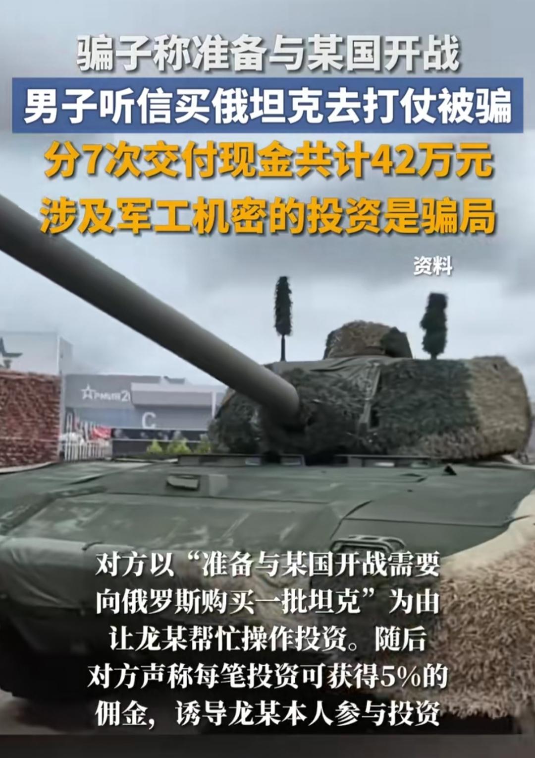 谁能想到这年头还有这么离谱的骗局!湖北一男子被骗子忽悠“要和某国开战,得向俄罗斯买坦克”,居然真的转了42万,这操作直接让网友看傻了。 骗子的话术听着就魔幻,居然拿“开战买坦克”当借口,换谁看都觉得不真实。可当事人愣是信了,一步步掉进圈套,最后损失42万血汗钱。想想普通人攒这些钱得多不容易,真让人揪心。 网友刷到新闻后议论纷纷:“这骗子脑洞也太大了”“怎么会有人信这种话”。其实骗子就是抓准了某些人的心理,编出离谱话术钻空子。不管骗局多荒谬,都有人可能中招。 你见过最离谱的诈骗是什么样?觉得该怎么避免被这类奇葩骗局忽悠?来评论区聊聊~
