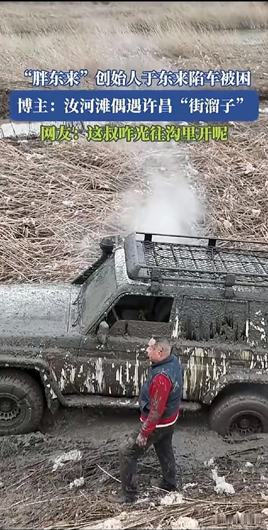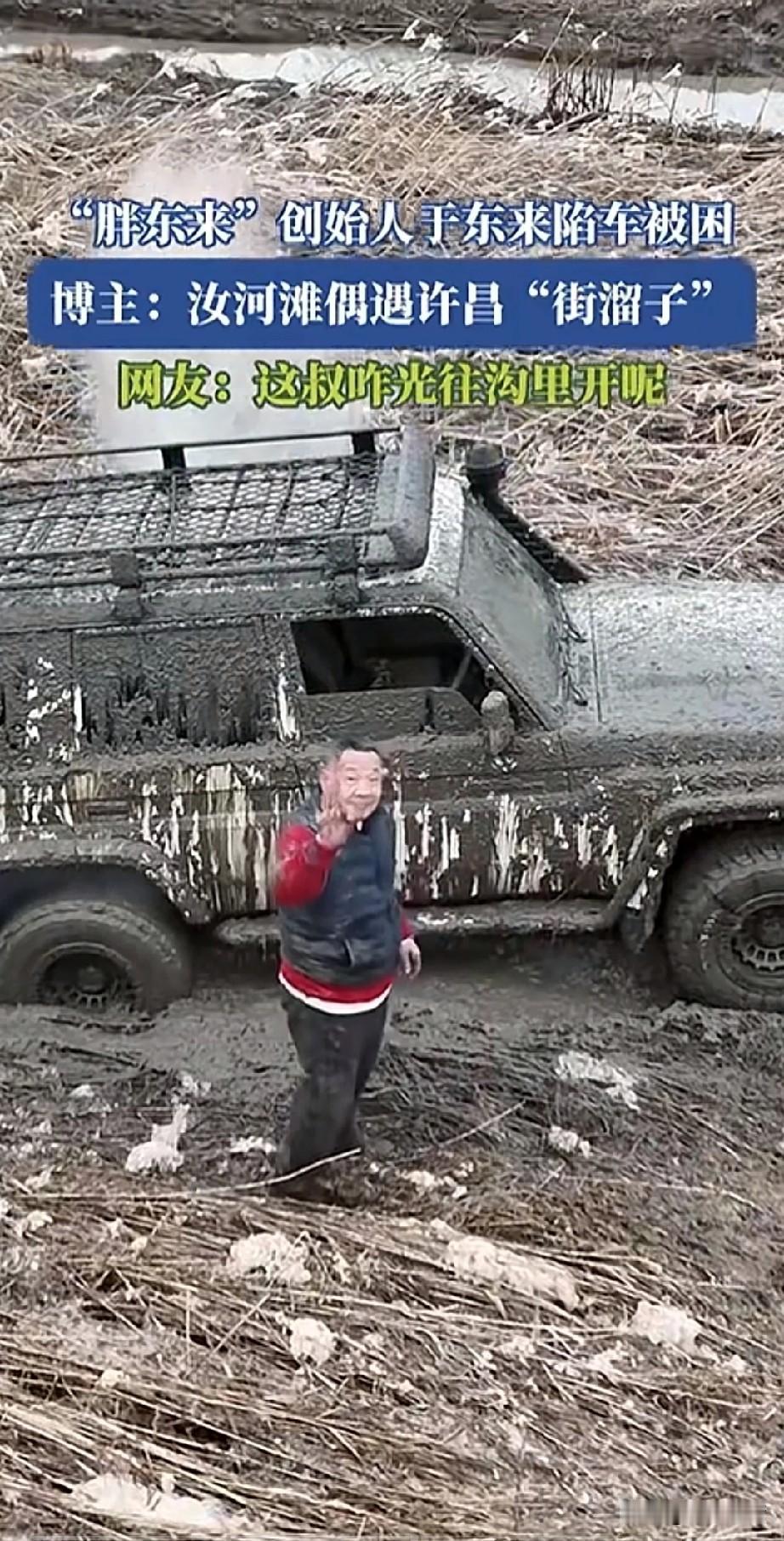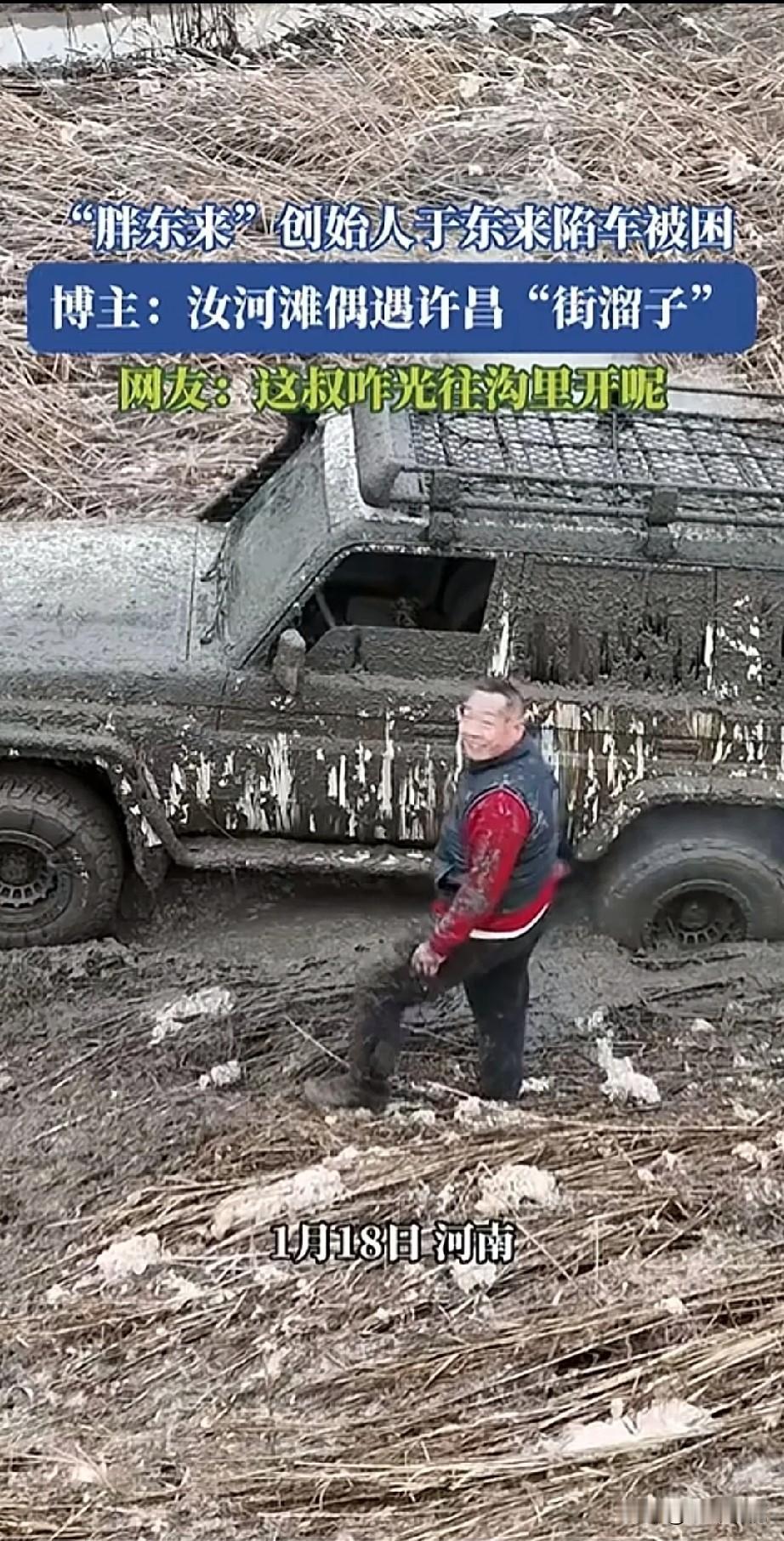 许昌街溜子胖东来的创始人, 居然掉进了河沟子里, 他的白色车也被污泥弄脏了, 不过人没有事, 有网友路过,看到了这个场景, 就拿起手机给于东来录了像, 于东来看到网友之后, 很热情的对着网友打招呼, 丝毫没有出事故的不开心, 或许他自己还发了朋友圈, 汝河摊明明不让停车, 他却被困在了那里, 还不赶紧打救援电话, 拍视频不太好吧! 毕竟那里也不让停车呀! 网友表示这叔咋往沟里开? 胖东来 于东来