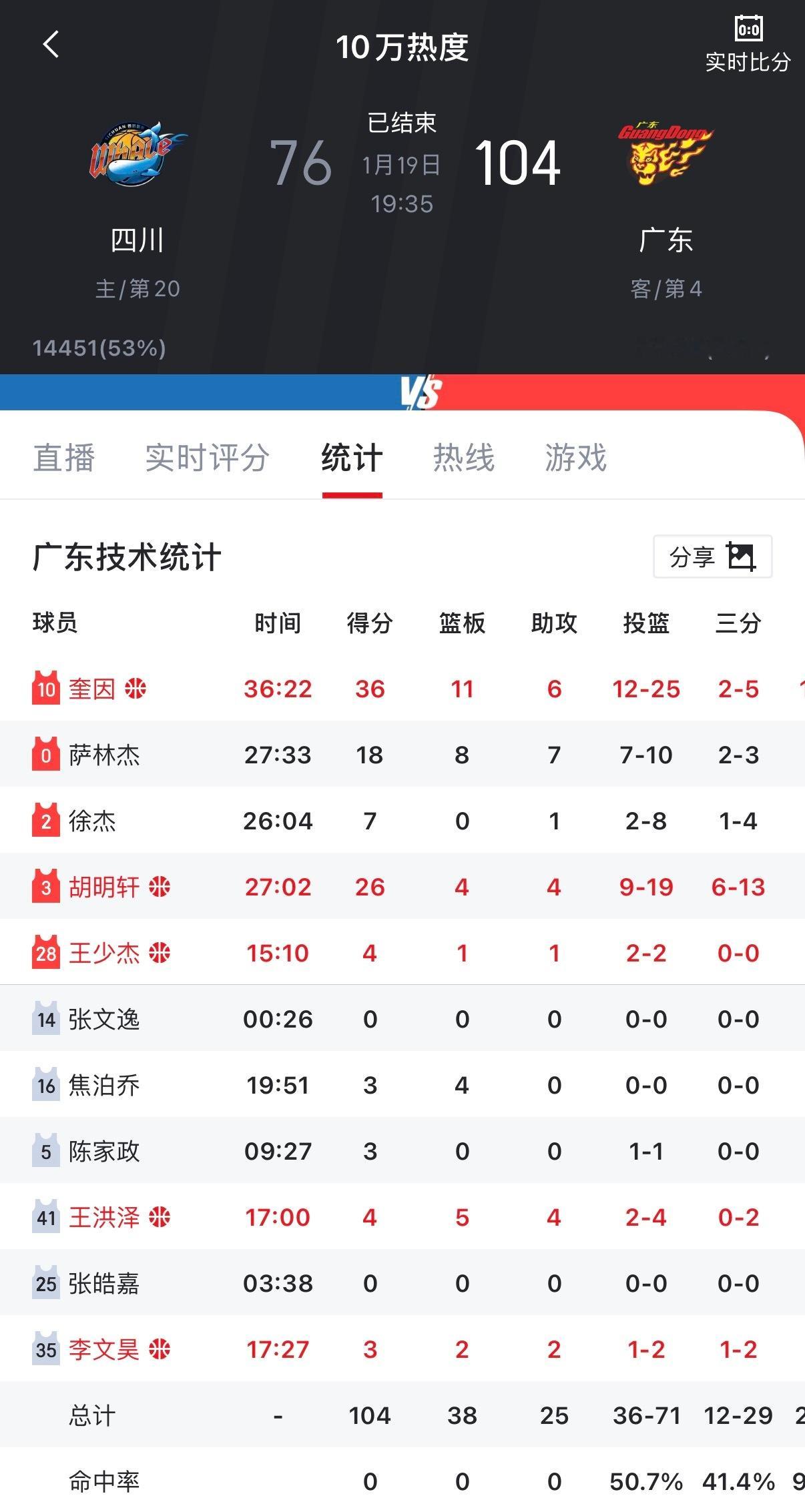 胡明轩四川男篮vs广东男篮 🏀CBA联赛25-26赛季常规赛第17轮⛹️ 全场比赛结束 广东东阳光 104 🆚 76 四川丰谷酒业数据方面:🐯胡明轩26分4篮板4助攻萨林杰18分8篮板 奎因36分11篮板 徐杰7分1助攻 焦泊乔3分4篮板 王少杰4分1篮板 陈家政3分 王洪泽4分5篮板 李文昊3分2篮板 下一场:1月21日 广东vs吉林(客场)记得收看哟~ 📺