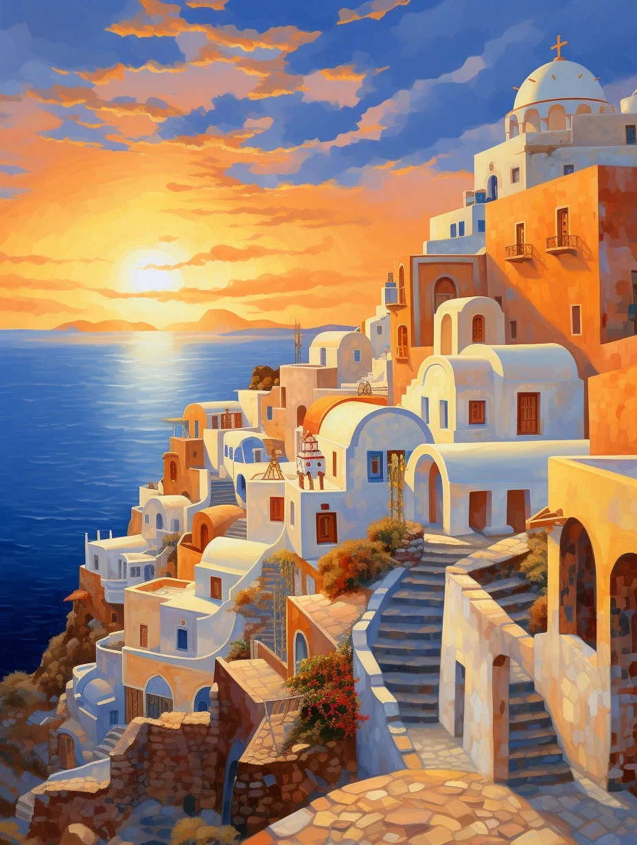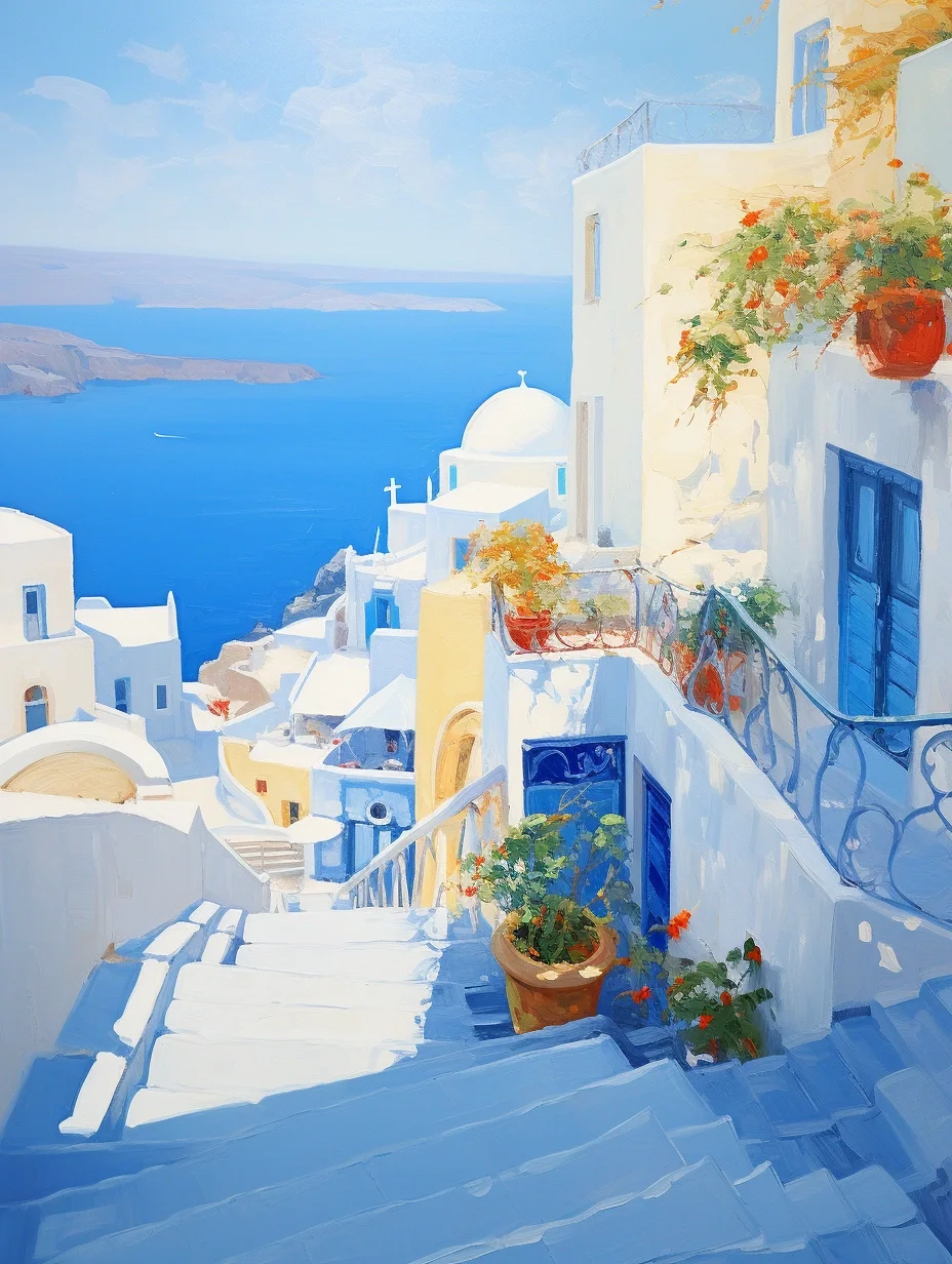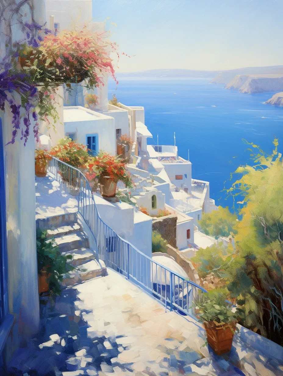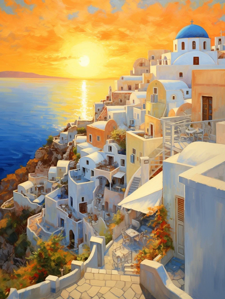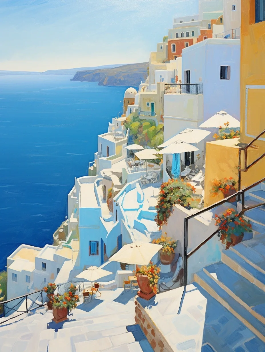 油画 midjourney 油画风景 治愈系风景 Ai绘画 旅行 希腊 圣托里尼