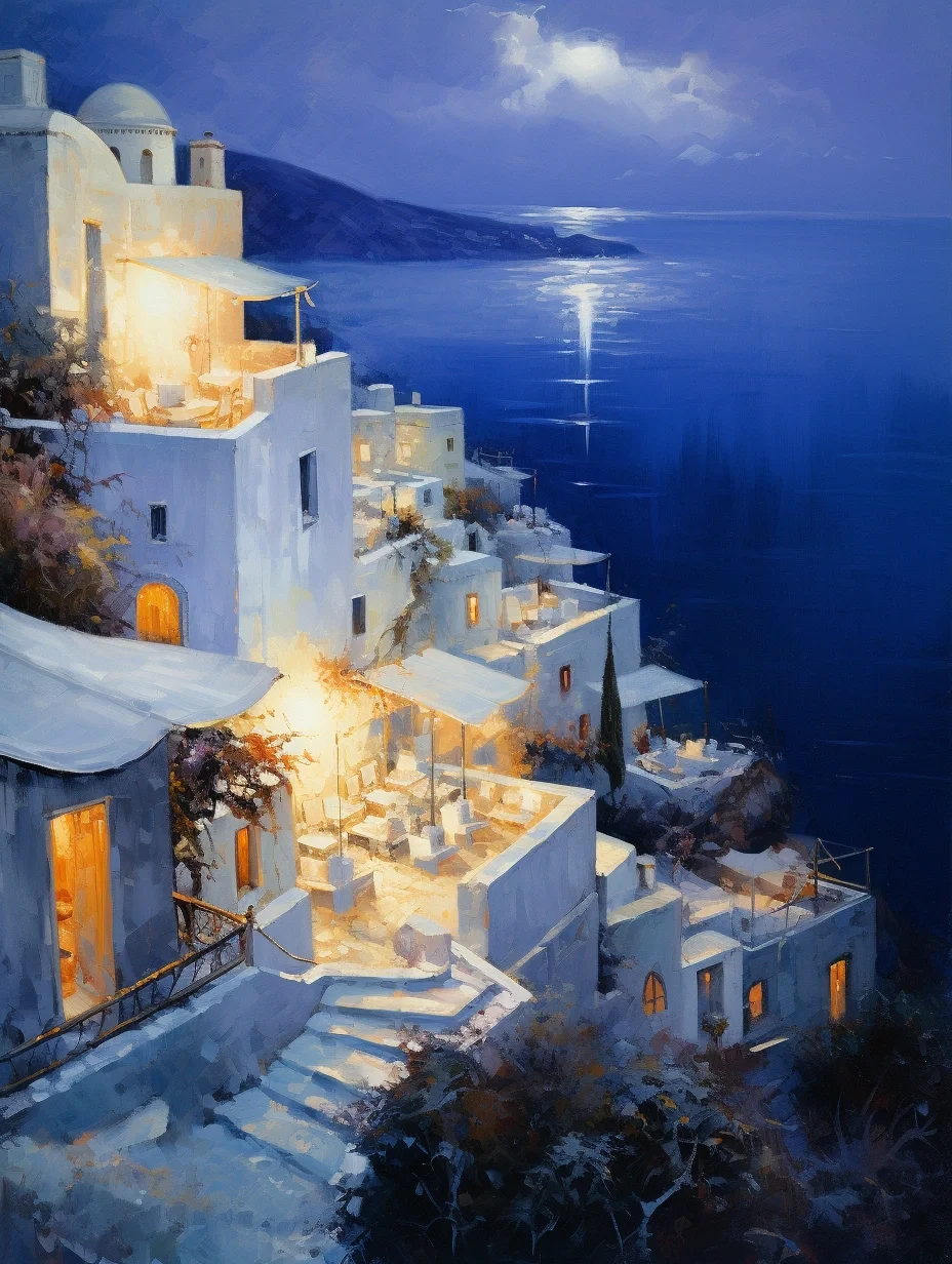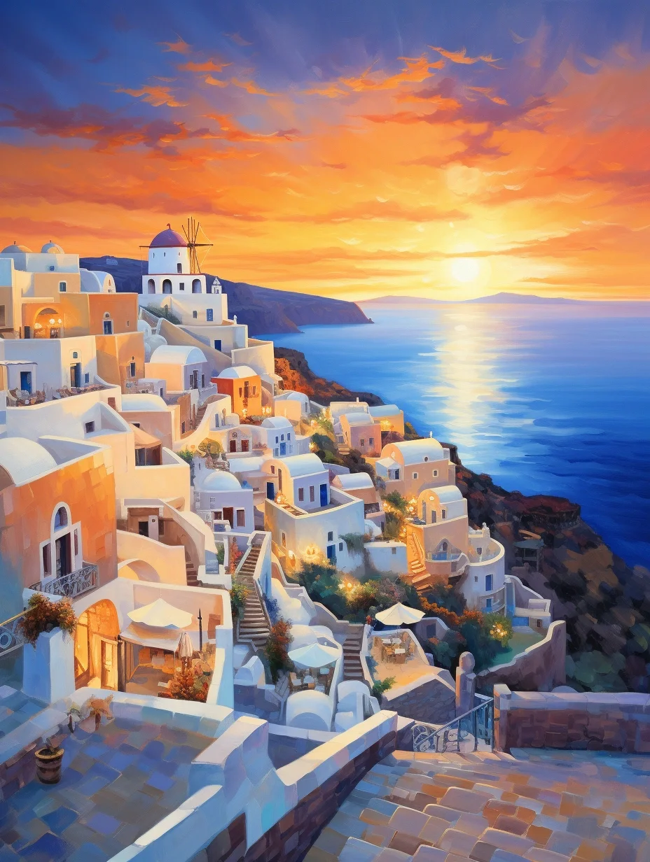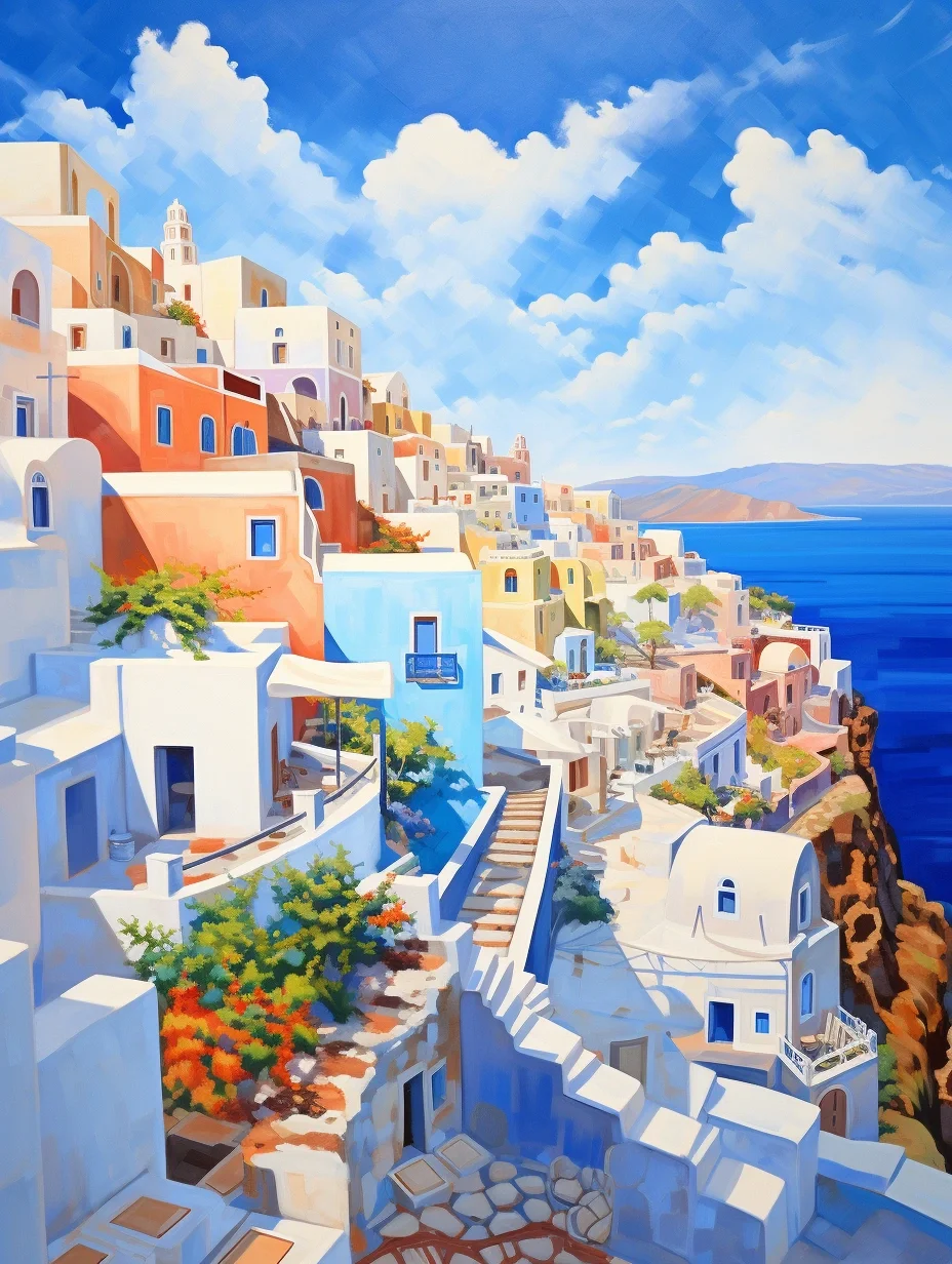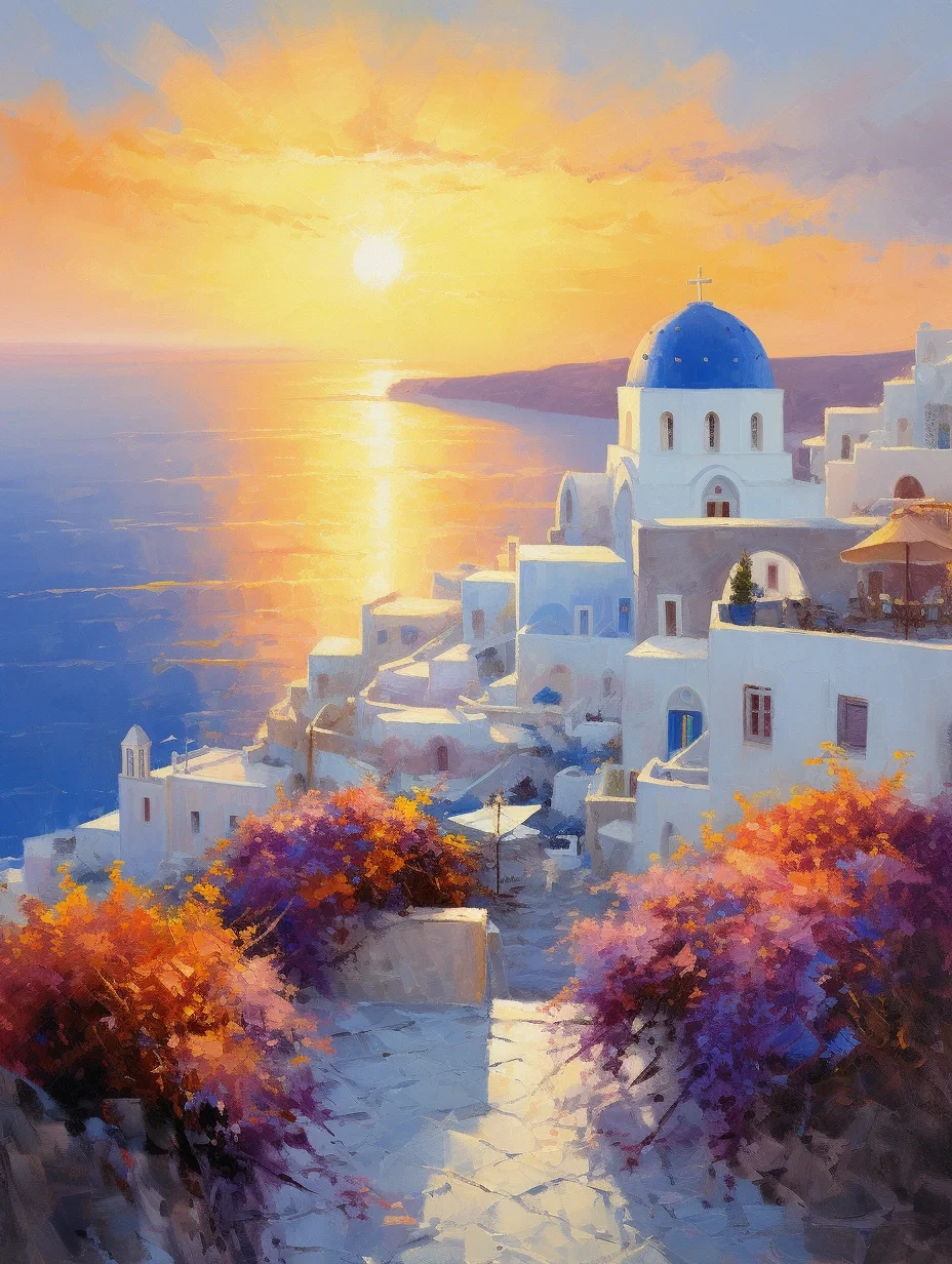 油画 midjourney 油画风景 治愈系风景 Ai绘画 旅行 希腊 圣托里尼