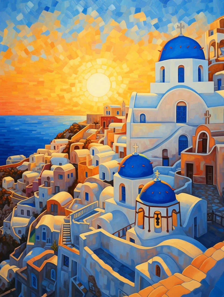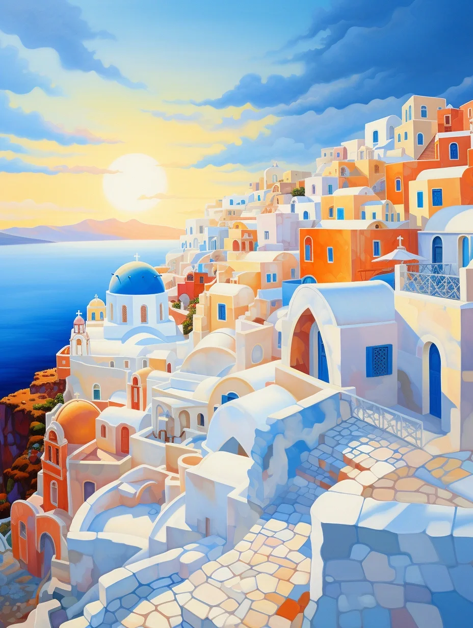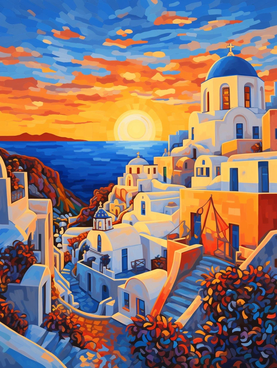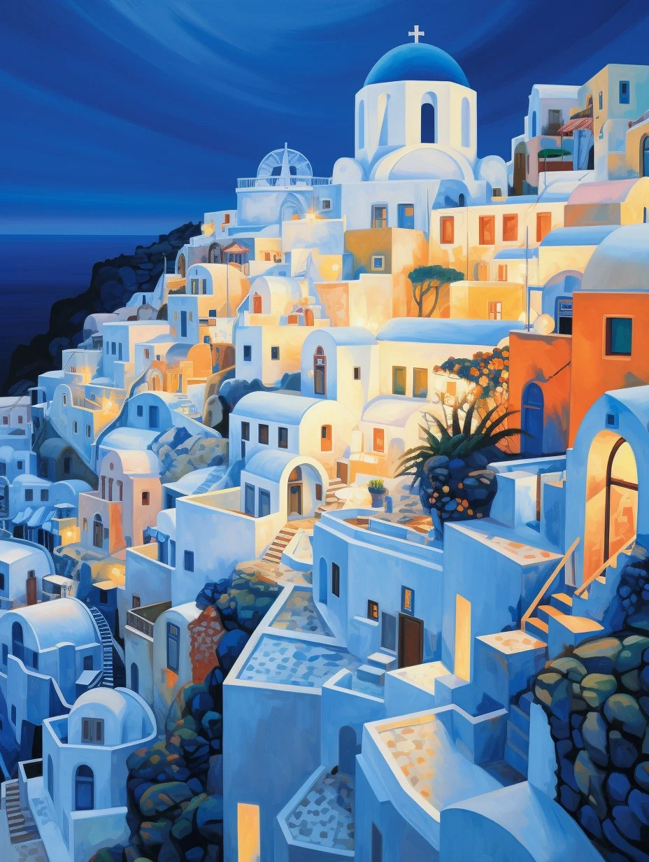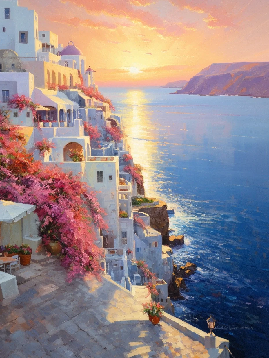 油画 midjourney 油画风景 治愈系风景 Ai绘画 旅行 希腊 圣托里尼