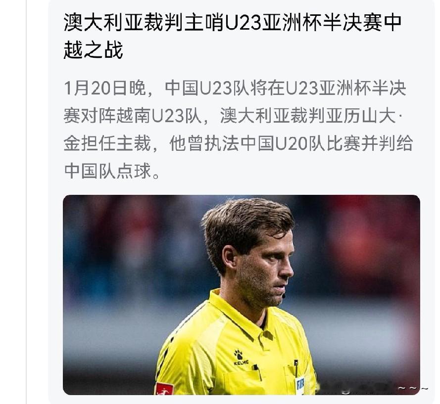 最新消息! 就在刚刚,得知,澳大利亚裁判主哨中越之战!心里立马咯噔了一下,会不会有黑哨啊? 为啥我说担心有黑哨啊?我们U23跟澳大利亚踢的时候,澳大利亚信誓旦旦要拿下我们,结果懵逼了,没有得到他们想要得的结果,最后8强也没进入,就打包回家了。 也就是明天晚上吧,中国跟越南就进行半决赛之争了,这个澳大利亚裁判稍微动点心思,就那一个球的事,就有可能败给越南。毕竟,进行一场比赛,裁判的作用不容小觑,你们说呢?[捂脸]