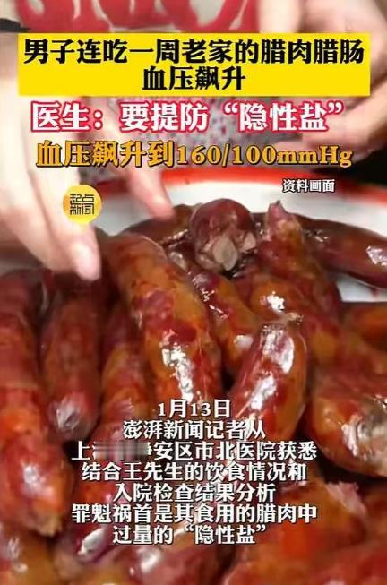 悲剧还是发生了!上海,一男子收到老乡寄过来的腊肉后,每顿饭都要吃上几口,谁知,仅仅只过了一周,男子感觉头晕乏力,口干舌燥,去医院一查,才发现自己血压飙升,比之前高多了,而罪魁祸首就是他每吨必吃的腊肉!网友:腊肉虽好,可不要贪吃哦! 王先生说,这箱腊肉是老乡自家腌制的,肉质紧实、香味浓郁,比外面买的更对胃口。收到货的当天中午,他就迫不及待炒了一盘腊肉,配着米饭吃了两大碗。 之后不管是午餐还是晚餐,餐桌上都少不了腊肉的身影,有时早餐煮面条,也会切几片腊肉增香,一周下来,半箱腊肉都被他消灭殆尽。 起初出现头晕症状时,他还以为是最近工作劳累、睡眠不足导致的,没放在心上,直到症状持续加重,甚至走路都有些发飘,才在家人的劝说下前往上海市静安区市北医院就诊。 接诊的心血管内科主任曹华明,结合王先生的饮食情况和检查结果,很快就找到了病因。 曹华明解释,腊肉这类腌制食品为了防腐保鲜、提升风味,制作时会加入大量食盐,属于典型的“隐性盐”重灾区,和日常炒菜时添加的“显性盐”不同,这些隐藏在食物里的盐分不容易被察觉,却会在不知不觉中超标摄入。 成年人每天食盐摄入量应控制在5克以内,而一块普通腊肉的含盐量就可能超标数倍,王先生连续一周顿顿吃腊肉,相当于每天摄入远超标准的盐分,再加上冬季气候干燥、户外活动减少,体内钠水潴留加剧,直接导致了血压急性升高。 医生还提醒,过量摄入“隐性盐”的危害远不止升高血压。多余的钠需要通过肾脏排出体外,长期高盐饮食会加重肾脏负担,严重时可能引发肾结石、肾炎等疾病; 同时还会影响人体对钙的吸收,加速钙流失,增加骨质疏松的风险,甚至会破坏胃黏膜屏障,让幽门螺杆菌更易定植,提升胃癌的发病概率。 近期医院已经连续接诊多例类似病例,大多都是冬季频繁食用腊肉、腊肠,或是经常吃火锅、麻辣烫等重口味食物导致的。 营养科负责人周卓君也给出了针对性建议,冬季进补要尽量避开高盐加工食品,优先选择新鲜的肉类、蔬菜和豆制品。 如果想吃腊肉等腌制食品,一定要控制食用量,每次吃一两片即可,不要顿顿都吃,烹饪时还可以搭配芹菜、冬瓜等富含钾的蔬菜,帮助促进钠的排出,维持体内电解质平衡。 烹饪方式上,可采用蒸、煮的方式替代爆炒,减少额外盐分的添加,也可以用醋、葱姜蒜等天然香料提味,逐步适应清淡口味。 这件事被分享到网上后,引发了不少网友共鸣,有人说自己也爱好吃腊肉,没想到危害这么大,也有网友调侃“腊肉虽好,可不要贪吃哦”,提醒大家重视饮食健康,别让美味变成健康隐患。