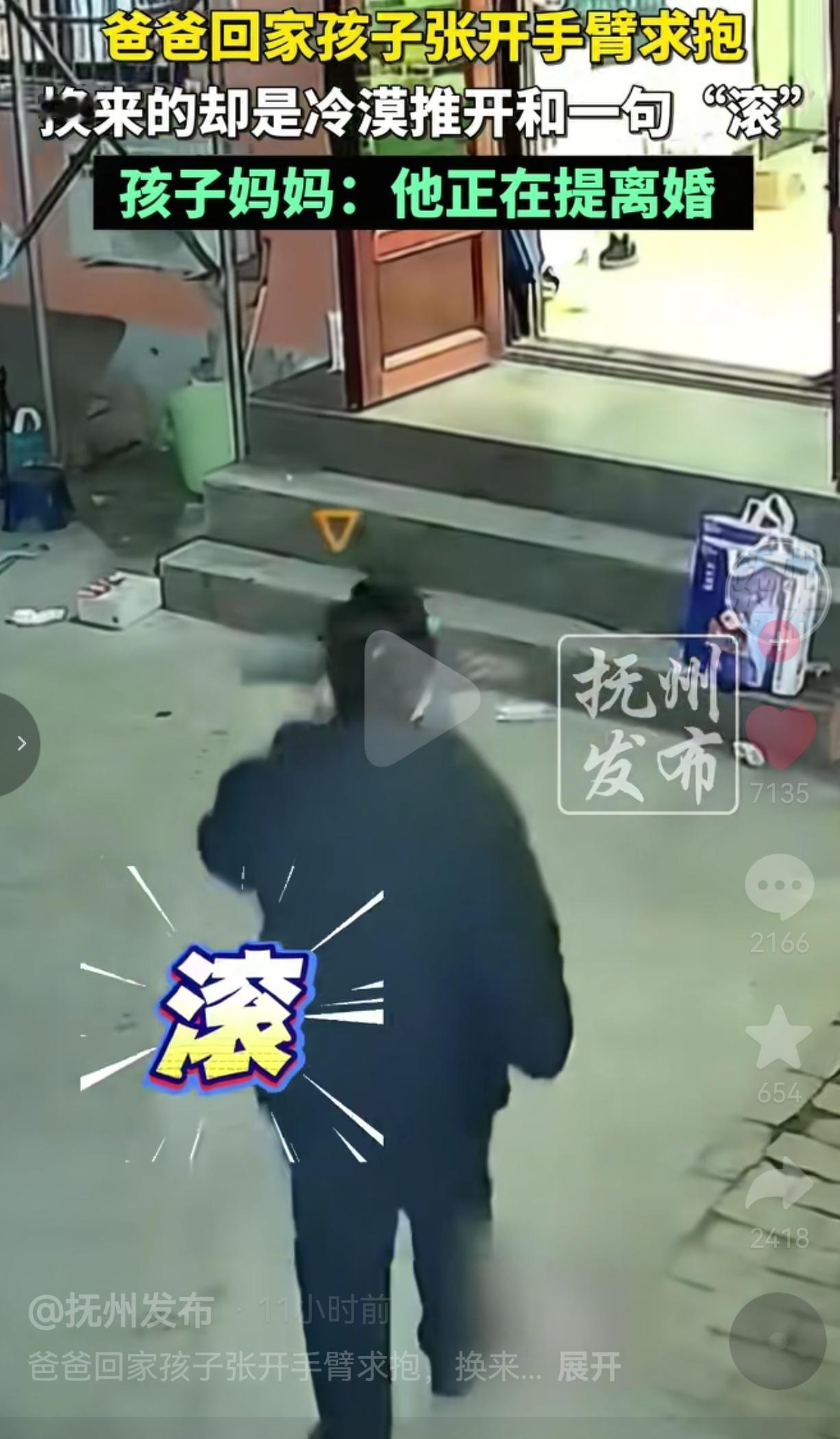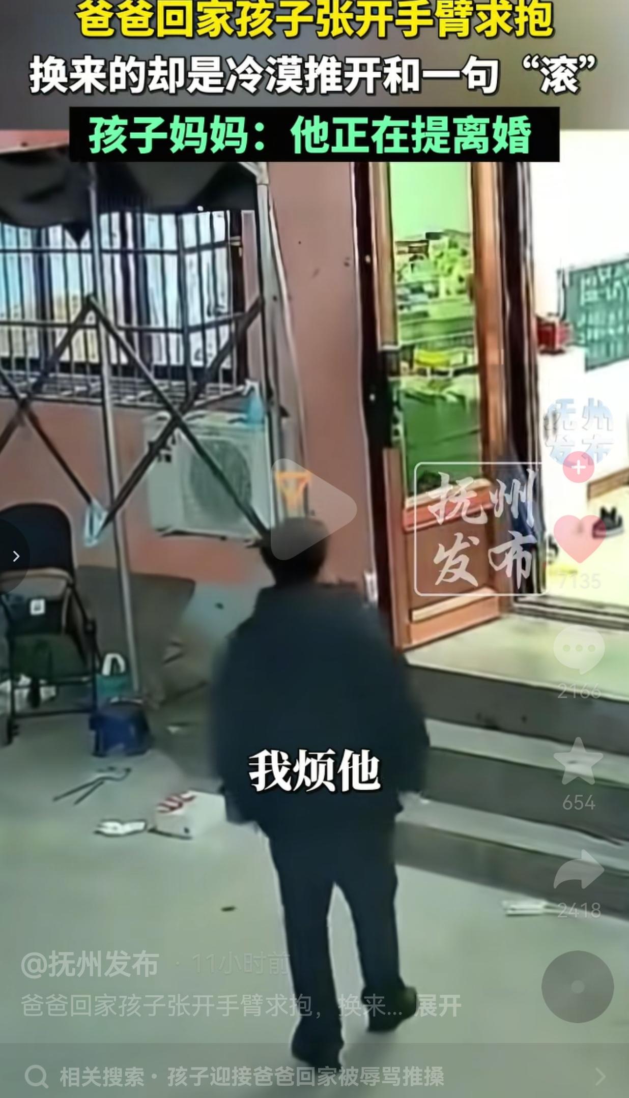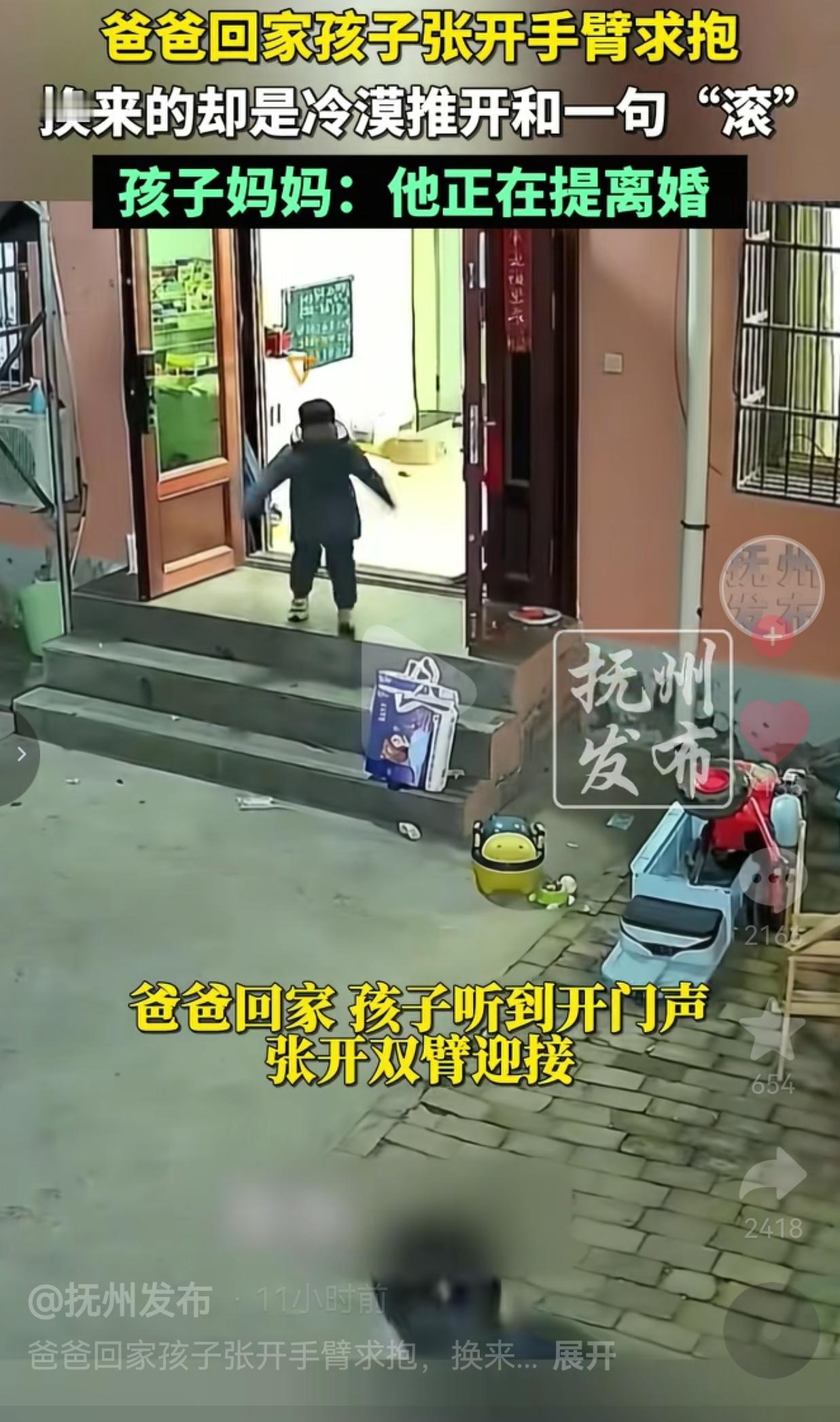 大人的恩怨,别拿孩子撒气!孩子是无辜的。河南一男孩,听到爸爸开门的声音,立刻兴奋地张开双臂冲过去求抱抱。 本以为爸爸会长开双臂,紧紧地拥抱自己的儿子,可是迎接他的,却是爸爸冷漠的一推,还有一句扎心的“滚”。 为什么爸爸会这么对待自己的儿子呢?据孩子妈妈说,爸爸正在提离婚,可能心情不好,这次回家是来拿衣服的。 男孩的妈妈听到老公对孩子说这种话,直接抱着第二胎,质问老公:“你为什么叫他滚?” 而孩子的爸爸只是轻飘飘地回了一句:“我烦他。” 紧接着,两个人又为了房子争执起来,丈夫强调“这房子是我的,因为,这套房子写的我的名字。” 妻子对此也毫不示弱:“房子是你的又怎么样,现在俺娘仨住,就是俺娘仨的,出去!” 两个人吵得不可开交,当时孩子就站在一旁,小小的身影不知所措,刚才还满是期待的眼神,瞬间黯淡下来。 网友看到后评论说:“一个父亲竟然对自己年幼的儿子说出滚字,我一个外人都听哭了,真的不敢想孩子得多心碎啊。” 还有的网友说:“大人过不到一起去,离婚就离婚,但是,孩子是无辜的,别拿孩子撒气,他招谁惹谁了?” 孩子是无辜的,他这么小,根本不懂什么是离婚,什么是房产纠纷,他只知道“爸爸回家了,我想他了”。 最让人心寒的是爸爸那句“我烦他”。孩子做错了什么?他只是想抱抱自己的爸爸,却成了爸爸“心烦”的出气筒。 在大人眼里,房子、财产比孩子的感受更重要。在孩子眼里,爸爸的拥抱才是全世界。 这个爸爸的行为,不仅伤害了孩子,也暴露了他的自私和懦弱。他不敢面对婚姻的失败,就把气撒在最弱小的孩子身上。他不敢承担父亲的责任,就用“烦他”来掩盖自己的逃避。 这样的男人活的太失败了,也不怕等你老了,不能动了,孩子对你记仇,也不来看你,到时候就只知道什么叫做“自作孽不可活了!” 对此,你有什么看法呢?