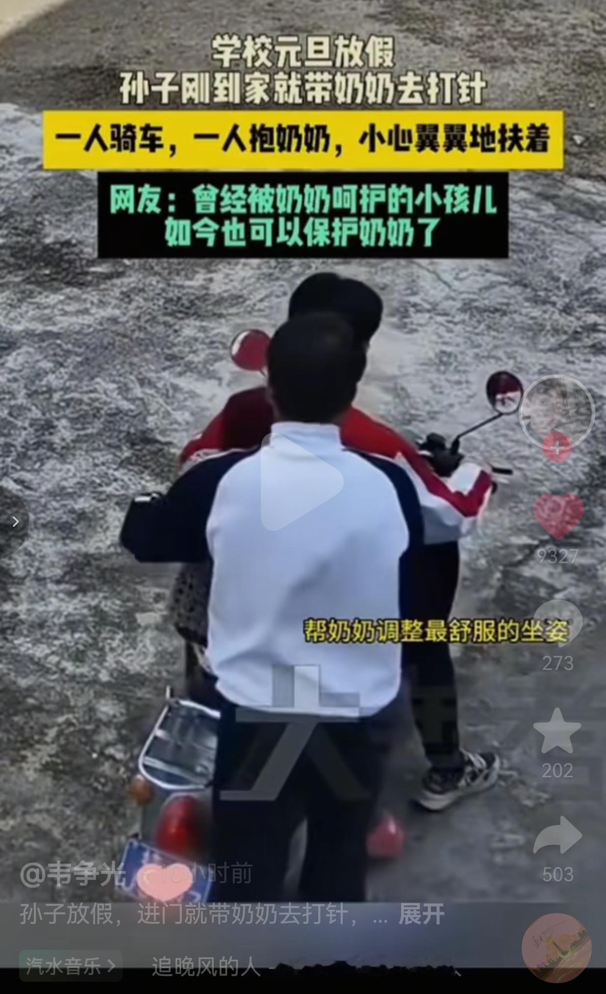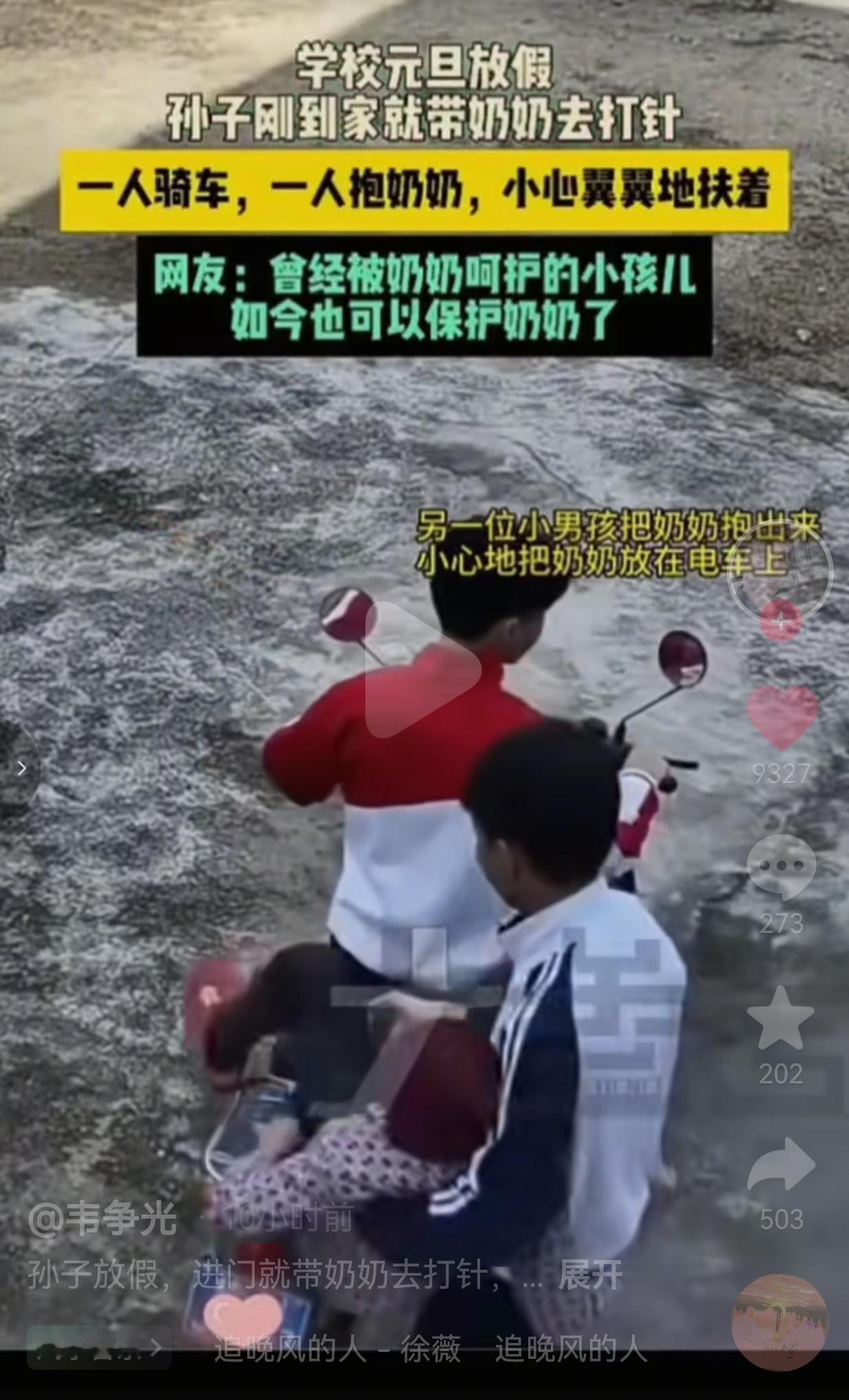 这就是养孩子的意义吧!太暖心了!广东两个小男孩,学校元旦刚放假,他们俩回家看看奶奶,一进门就听说奶奶身体有点不舒服,他们俩不敢犹豫,立刻决定带奶奶去卫生院打针。 他们俩分工明确:一个负责骑车,在将奶奶送上电动车之前,稳稳地握住车把,确保奶奶的安全。而另一个负责把奶奶从屋里抱出来,小心翼翼地放到电动车上,还帮她调整到最舒服的坐姿。 骑车的孩子全程手都转着圈扶着奶奶,生怕她坐不稳。后座的孩子更是时刻关注着奶奶的情况。 看到奶奶的腿耷拉在地上,赶紧蹲下来轻轻把腿抬到车上,最后直到奶奶示意可以走了,才安心坐稳。 网友们看完都忍不住点赞:“曾经被奶奶呵护的小孩儿,如今也可以保护奶奶了。” 也有的网友说:“这两个孩子长大肯定有出息,心这么善良,做事这么稳。” 还有的网友说:“奶奶这一辈子没白疼他们,这就是最好的回报。” 看到这一幕,我突然明白:最好的教育,从来不是书本上的知识,而是刻在骨子里的善良和孝顺。 这两个孩子的父母,一定很孝顺父母,给他们树立了良好的榜样,让他们知道“爱不是索取,是付出”。 反观现在很多孩子,被宠家长宠坏了,在家里衣来伸手饭来张口,甚至就连倒杯水都嫌麻烦。 可这两个孩子用自己的实际行动告诉我们:真正的富养,不是一味的满足孩子的要求,而是教会他们如何去爱、如何去感恩。 这两个孩子的故事,也让我想起一句话:你养我长大,我陪你变老。 小时候,奶奶把我们捧在手心。长大后,我们要把奶奶护在身后。