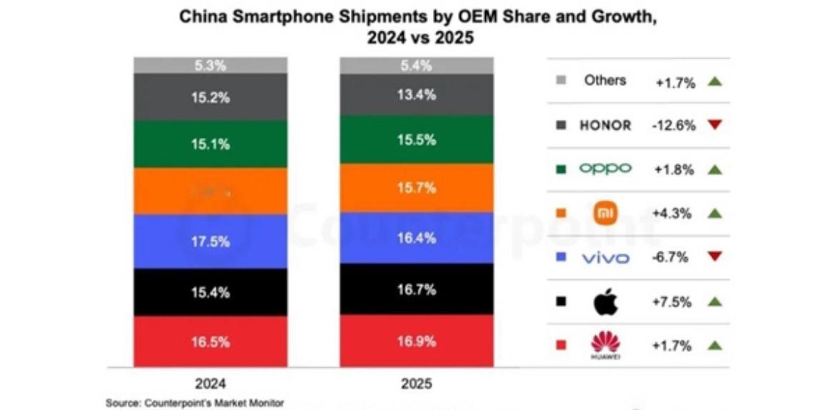 2025年第四季度中国智能手机出货量同比下滑1.6%,全年出货量同比下降0.6%,需求疲软叠加存储成本飙升成为主要拖累因素。 需要注意的是,尽管整体市场承压,苹果凭借iPhone 17系列强劲表现,以22%的市场份额领跑Q4中国市场。受益于Pro系列全新摄像头设计及基础款起始存储翻倍且售价不变,其出货量同比大增28%。不过,因iPhone Air发售延迟且定位权衡,初期贡献有限。