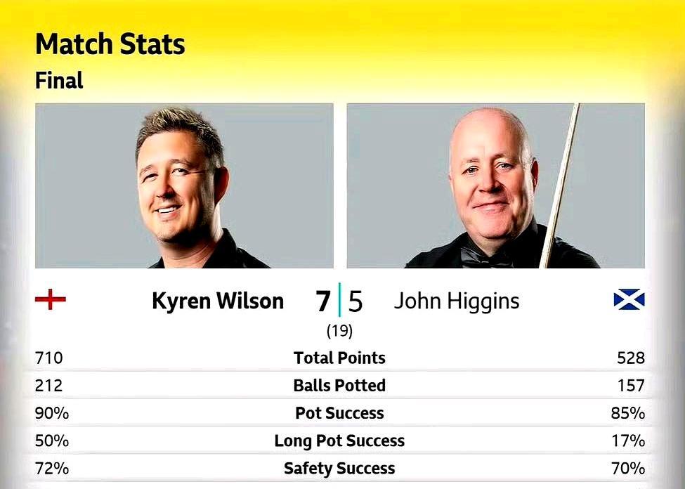 50岁希金斯被10-6打崩 长台命中率掉到19%,他扶着球杆喘气的画面全网刷屏。年轻十岁的威尔逊像换电池,连轰八杆破百,35万英镑直接落袋。 伦敦亚历山德拉宫这次成了分水岭。希金斯半决赛连追三局逆转世界第一特鲁姆普,把体能透支到决赛;威尔逊同样打到决胜局,却用116分绝杀吴宜泽,把杀气存进决赛。同样的剧本,结局天差地别。 有人替巫师惋惜,我却觉得值。50岁还能站在大师赛决赛,本身就是对岁月的反击。只是反击之后,身体先投了降。长台失准、简单粉球失误,不是技术退步,是心跳跟不上节奏。 威尔逊终于甩掉“两亚王”帽子,90后第一个凑齐世锦赛+大师赛。再拿一座英锦赛,就能追上75三杰的脚步。这一步,他等了七年。 吴宜泽首秀杀进四强,6-0横扫肖国栋那一场,比任何鸡汤都提神。中国五人参赛创纪录,却只剩他一个亮点。差距不在球杆,在心脏。下次别让机会溜走,你才22岁,时间站在你这边。