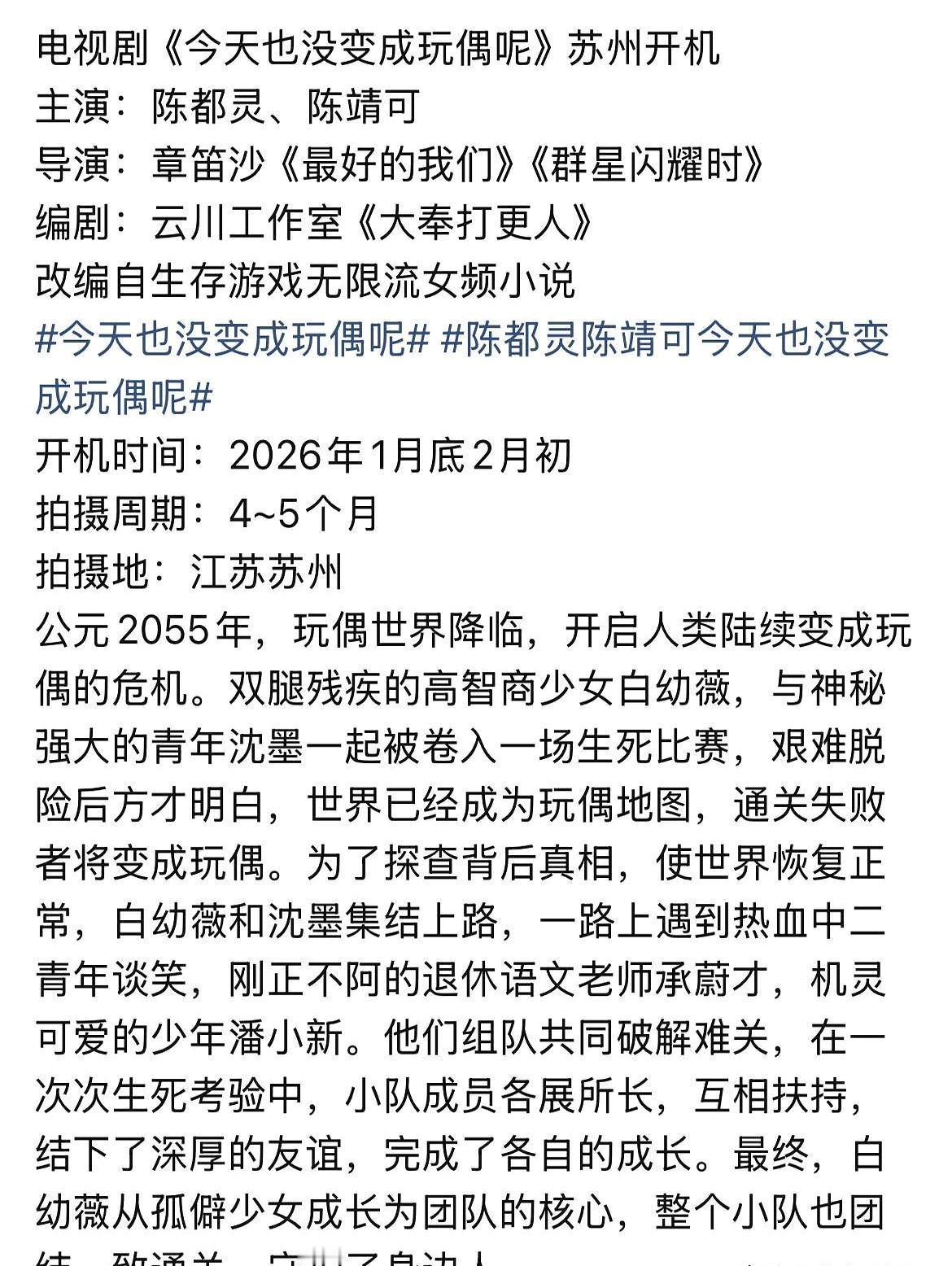 古装仙侠集体哑火,横店只剩150部长剧苟着,短剧却一天冒出十几个,古装换皮五分钟一条。 聪明人都去拍无限流了。 陈都灵这部《今天也没变成玩偶呢》刚在苏州开机,设定2055年玩偶病毒,输了直接变塑料,高智商残腿少女带队闯关,听着就带劲。 肖战那边《十日终焉》也在排队,男频国风循环局,书粉已经把他脑补成破局大神。 平台算盘打得响:古装审美疲劳,观众要烧脑,那就一起卷无限流。 短剧抢流量,长剧拼质感,古装只剩外壳,脑子才是新通行证。