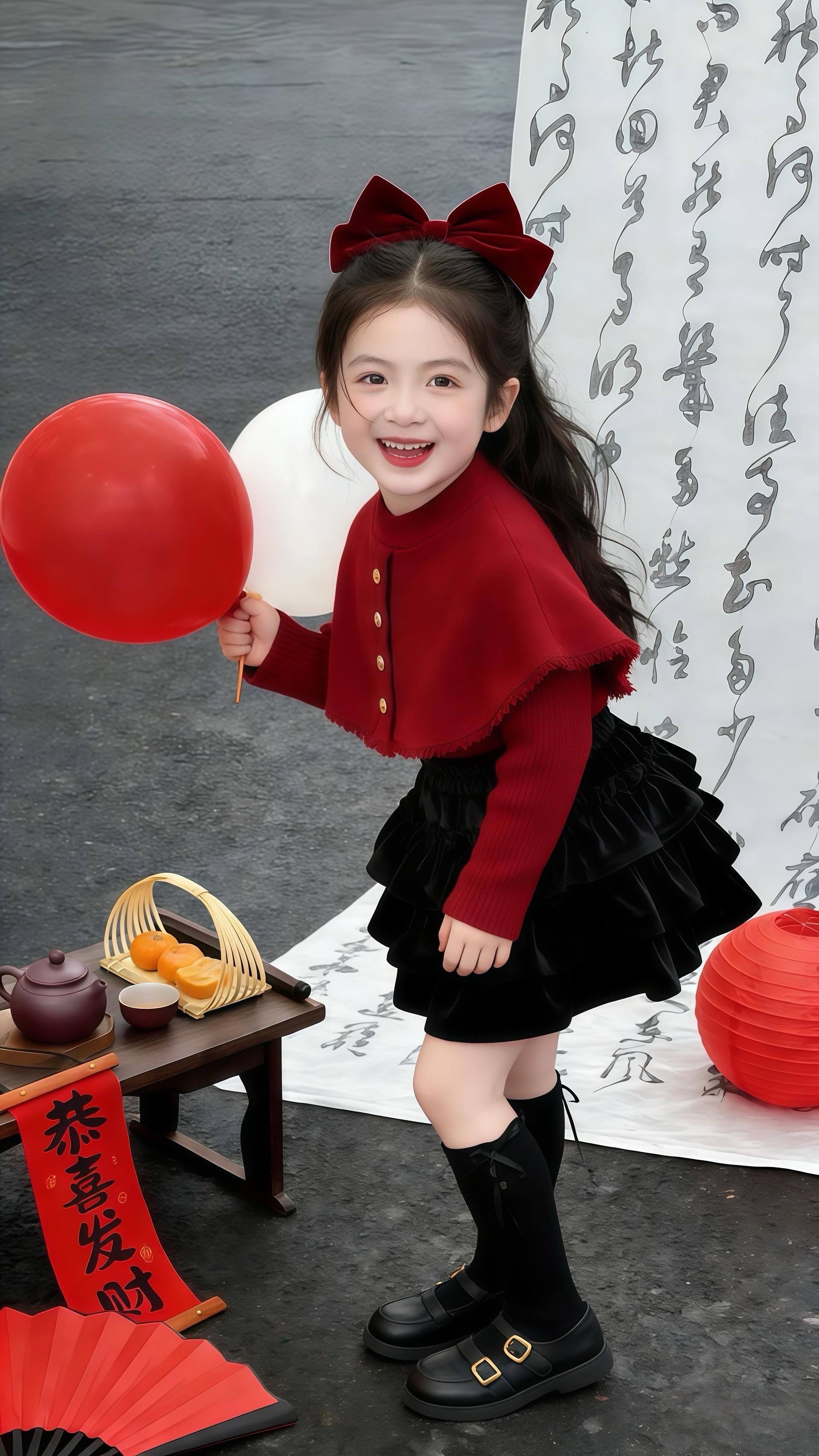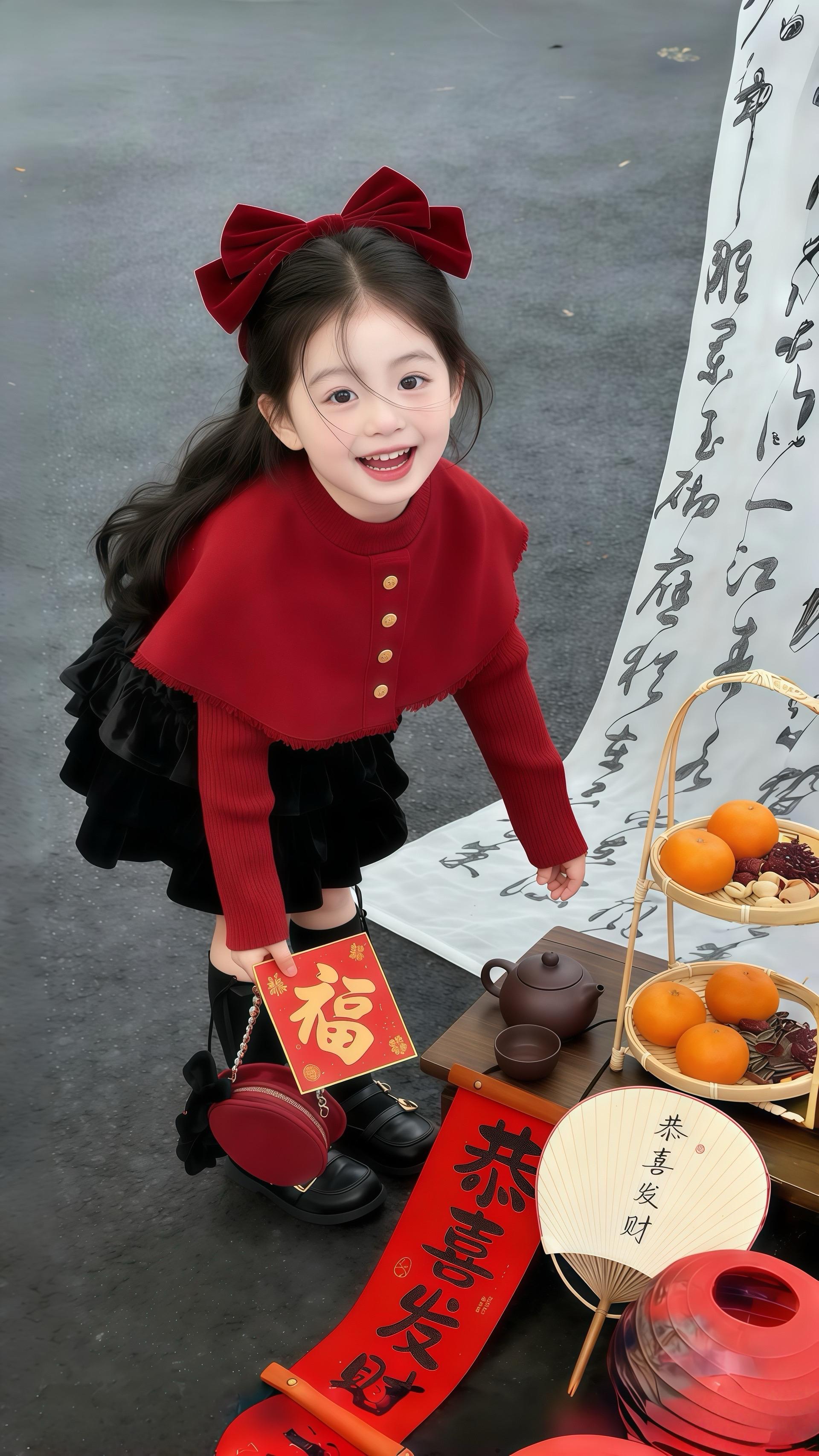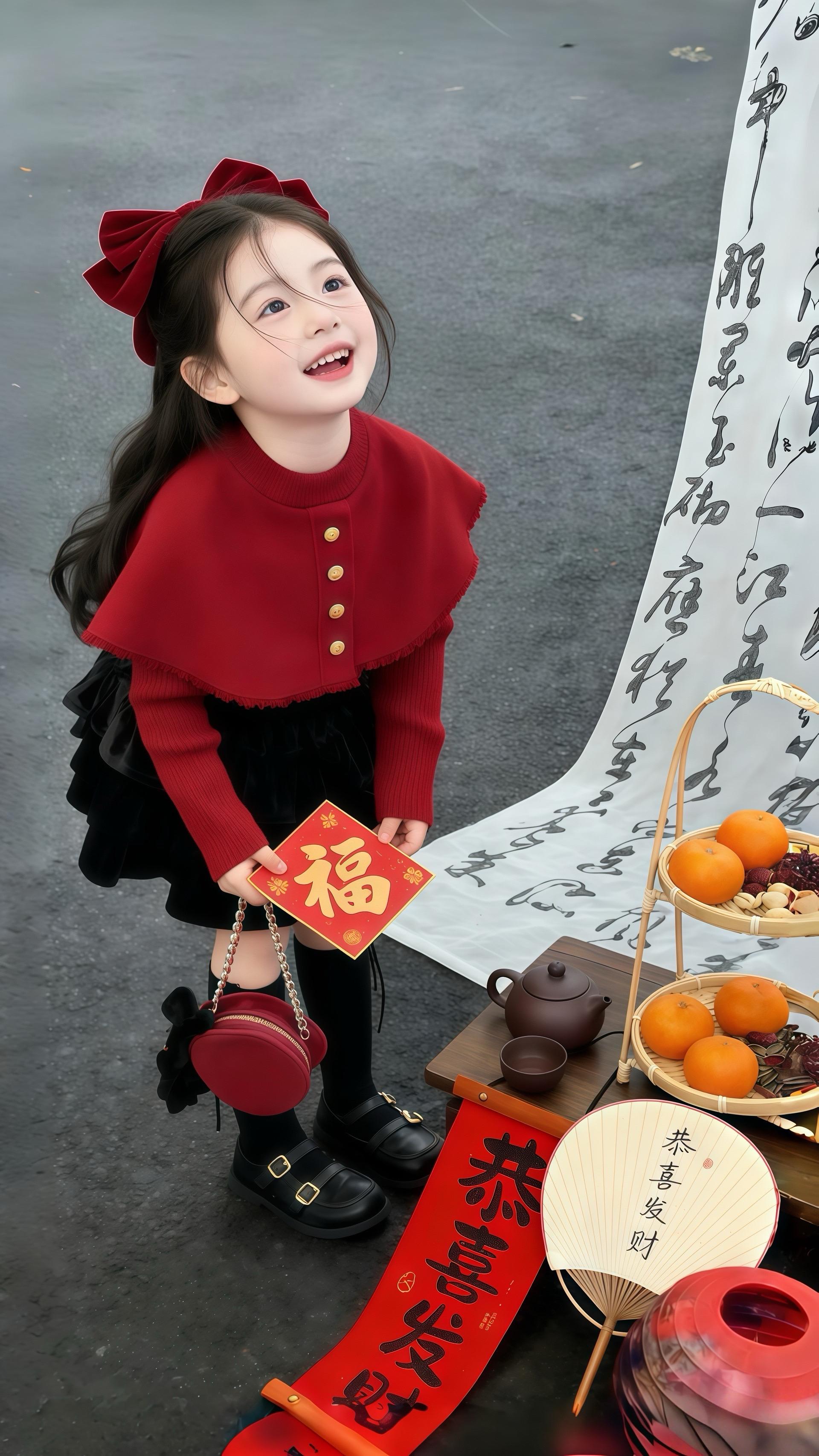 必入的新年童装!酒红斗篷+黑蓬蓬裙的组合,针织面料软糯亲肤,斗篷的纽扣设计方便穿脱,蓬蓬裙的版型超显瘦。过年穿这套拍全家福、走亲戚,氛围感直接拉满