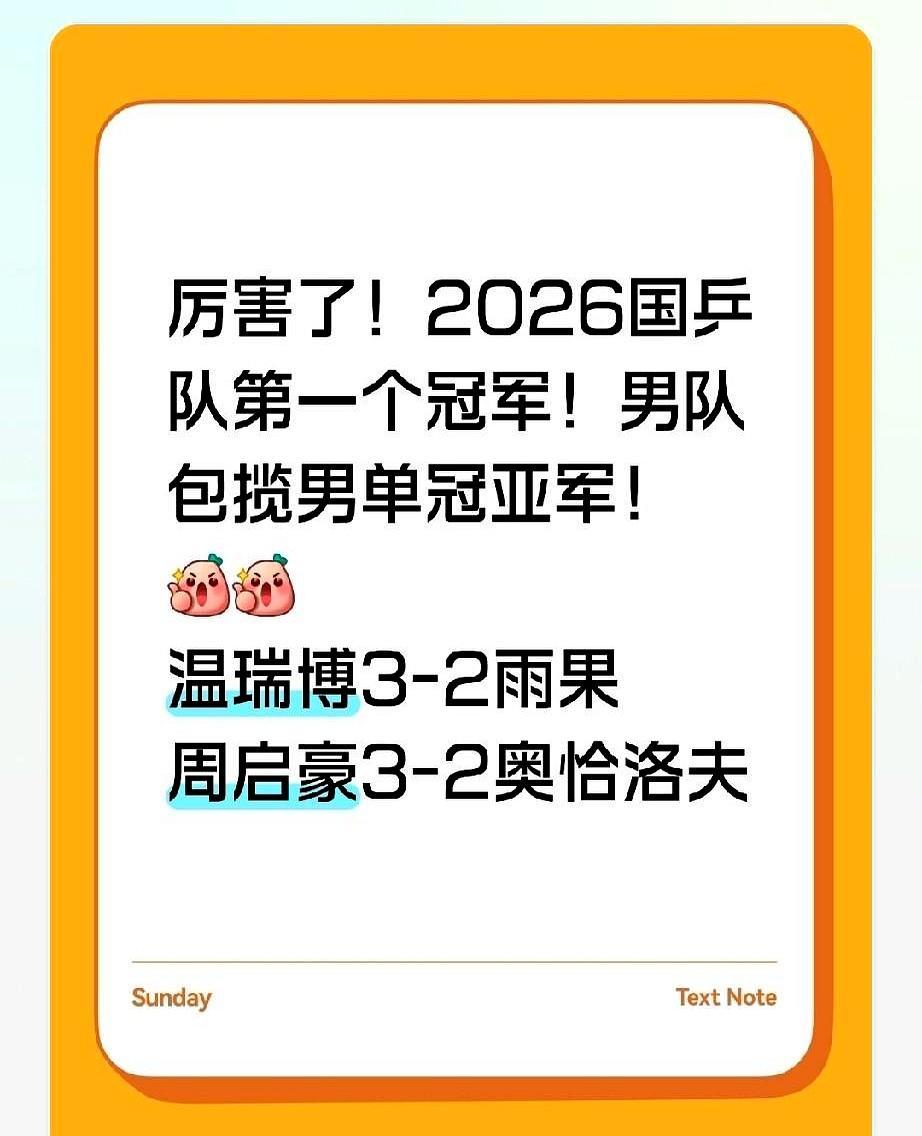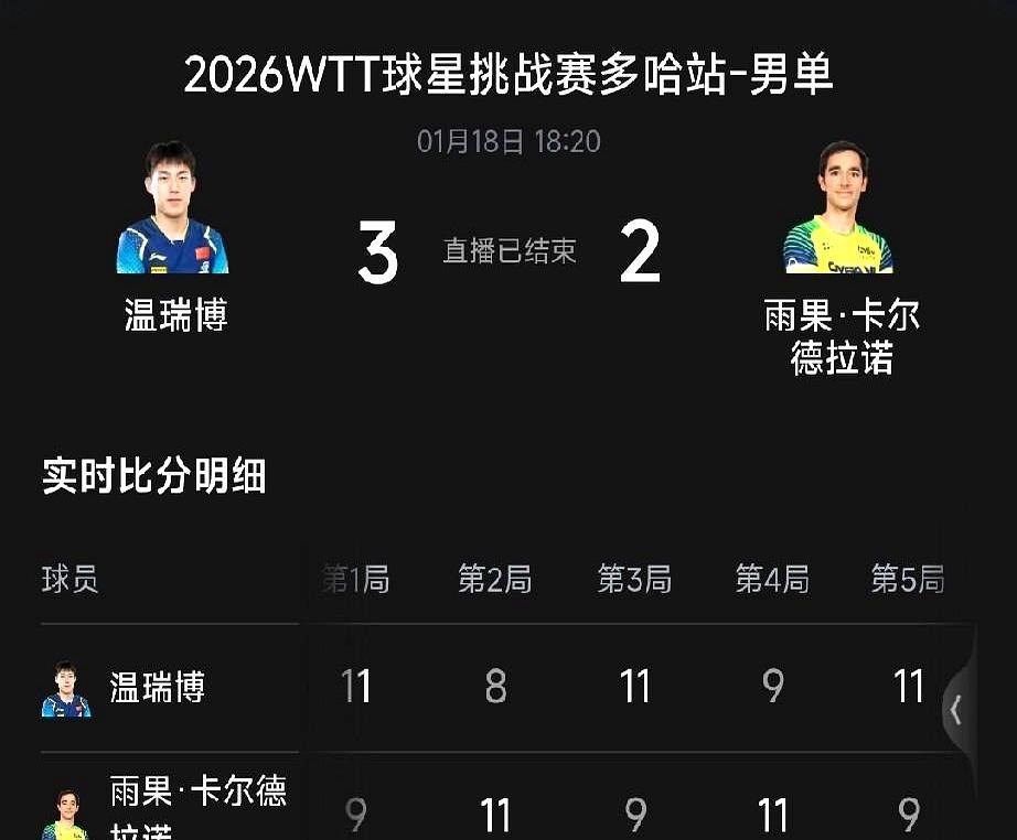 决赛前夜,19岁小温还在加练反手 练到凌晨一点,他知道自己明天打的是谁——周启豪,刚把奥恰洛夫逼到绝境的老大哥。小温没退路,资格赛一路杀上来,连雨果都被他3-2掀翻。那场球打了五局,每局分差不超过两分,最后一球雨果直接蹲在地上喘气。 第二天决赛更刺激。小温先拿首局,周启豪连追三局,第五局小温11-5扳回,第六局打到8平后,周启豪连得三分。4-2,冠军到手。小温蹲在挡板边,用毛巾盖住脸。没人怪他,从资格赛到亚军,已经够狠。 男双他和黄友政也打到决赛,输给韩国组合。一天两赛,体力见底。但观众记住的是这个画面:小温每打完一球就蹲下来擦汗,球拍始终攥在手里。 周启豪32岁,第一次拿球星挑战赛冠军。领奖时他把奖杯递给小温:明年换你举。