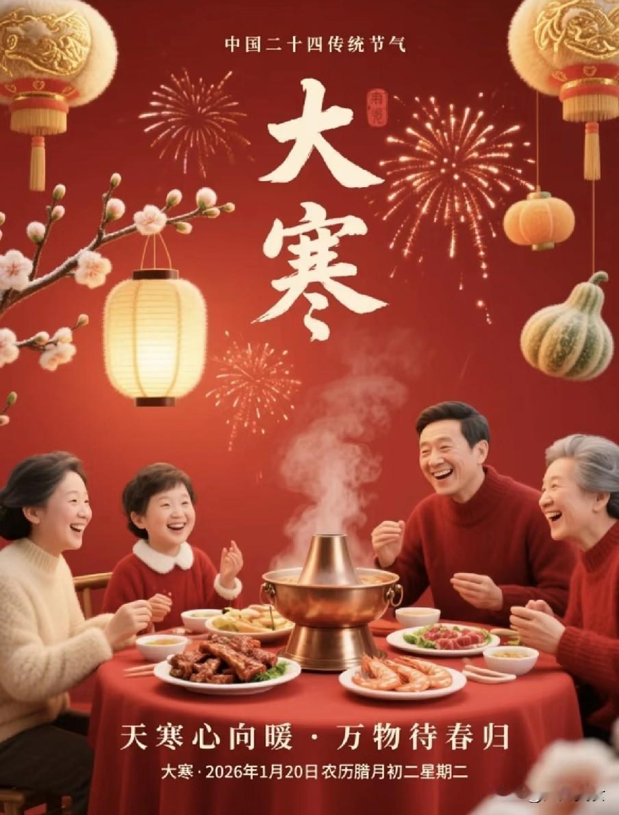 2026大寒60年难遇,2好2坏早知晓 1月20日9时44分,2026年大寒正式到来!作为二十四节气压轴节气,今年大寒堪称60年难遇——乙巳蛇年干支一甲子循环,叠加上午交节、月头大寒、早大寒、逢双日四大罕见特征,实属难得。 好消息接连而至:一是春寒概率大降,春节期间南方气温偏高2-4℃,北方无极端低温,走亲访友更舒适;二是中东部迎强雨雪,为北方冬小麦补水、冻死害虫,给南方油菜解渴,助力来年丰收。 坏消息需警惕:强寒潮带来“降温+大风+冰冻”三重暴击,中东部降温6-12℃,部分地区有冻雨;暴雪冰冻易致交通受阻、作物冻害、设施受损。 建议提前备好保暖装备,减少不必要外出,自驾备好防滑链;居家注意取暖和用电安全,农户做好作物防寒,提前储备生活物资,平安迎年!