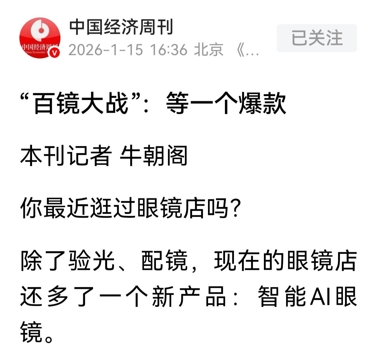 AI眼镜接管手机电话、联网等功能,“百镜大战”已经开启,AI眼镜会成为下一个热点吗? 雷鸟创新在CES展会推出了首款支持eSIM的智能眼镜,可以直接打电话、实现AI对话、实时翻译和播放流媒体,也就是手机能做的智能眼镜也能做,智能眼镜不需要想以往那样,需要链接手机或WiFi才能工作,标志着智能眼镜完成了从手机关联产品到独立智能终端的蜕变。 智能眼镜被广泛认为是“下一代智能终端”,也是物理AI的主要入口,这是因为智能眼镜具有天然的物理世界感知能力,数据与生态的协同价值突出。企业是不会放过这个机会的,纷纷下场开发自己的智能眼镜,仅仅在CES展会上,参展的中国智能眼镜厂商就有16家。有媒体形容为“百镜大战”并不为过,2025年底以来,百度、理想汽车、阿里、联想接连推出智能眼镜,加之早就下场的华为、小米、字节等老手,还有雷鸟、目影等新的垂类玩家。国外大厂Mate、谷歌、苹果、三星等也没闲着,这个市场真的是好不热闹。 有机构预言2026年是智能眼镜元年,也有人会怀疑一个小众极客玩具是否会变成大众消费品?相信业界的眼光,这么多企业包括科技大厂都发力智能眼镜,那这个市场离爆发期就不远了。据艾媒咨询显示,2025年智能眼镜销量激增1344.8万副,同比增长350.82%,到2029年有望突破1.3亿副。这确实是一个可能的消费大市场,但资本市场反映较为平淡,无论是产业链前端的光学显示模组、主控SOC芯片、感知与音频系统、电池与电源管理系统,还是中端的整机集成以及ODM/OEM代工,后端的应用领域都没有给出预期估值。等一个爆款产品或者触发事件出现,或许智能眼镜就是热点了。