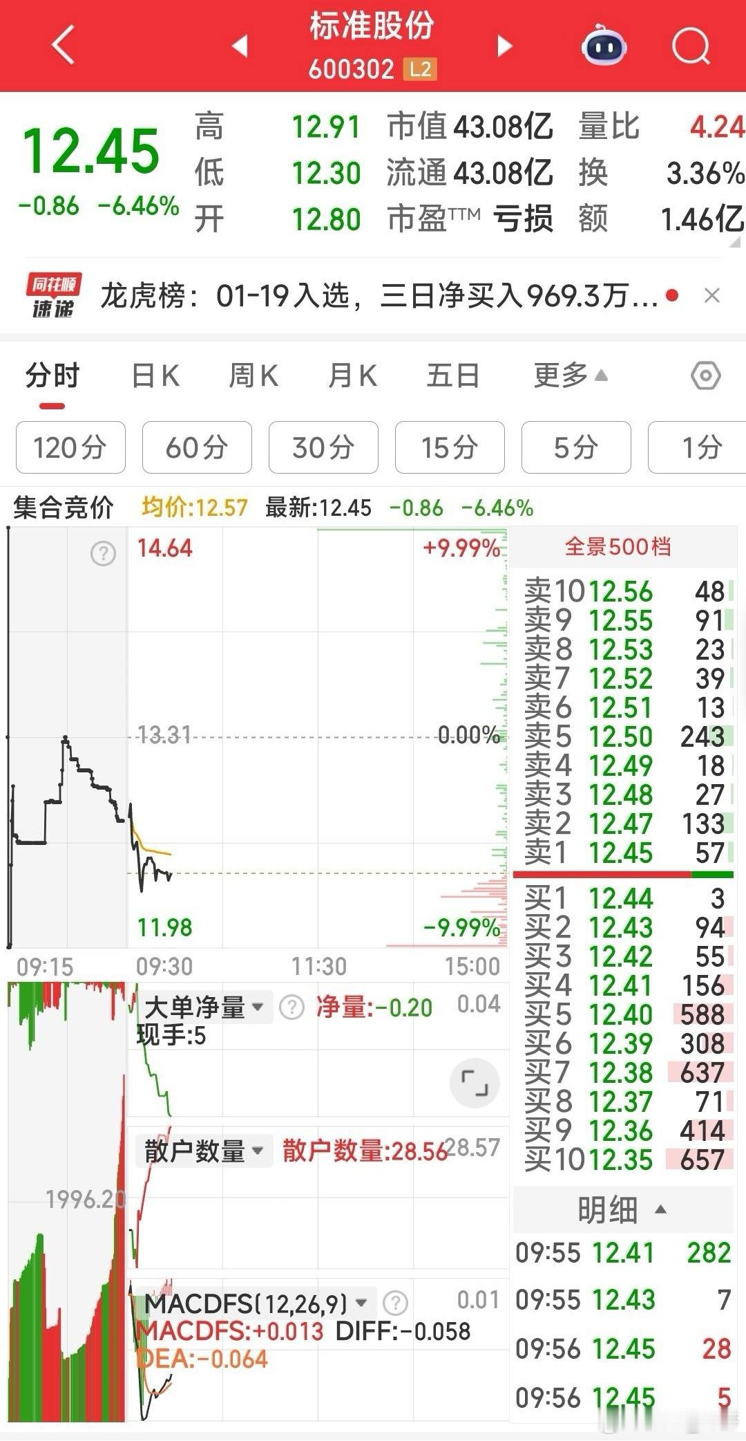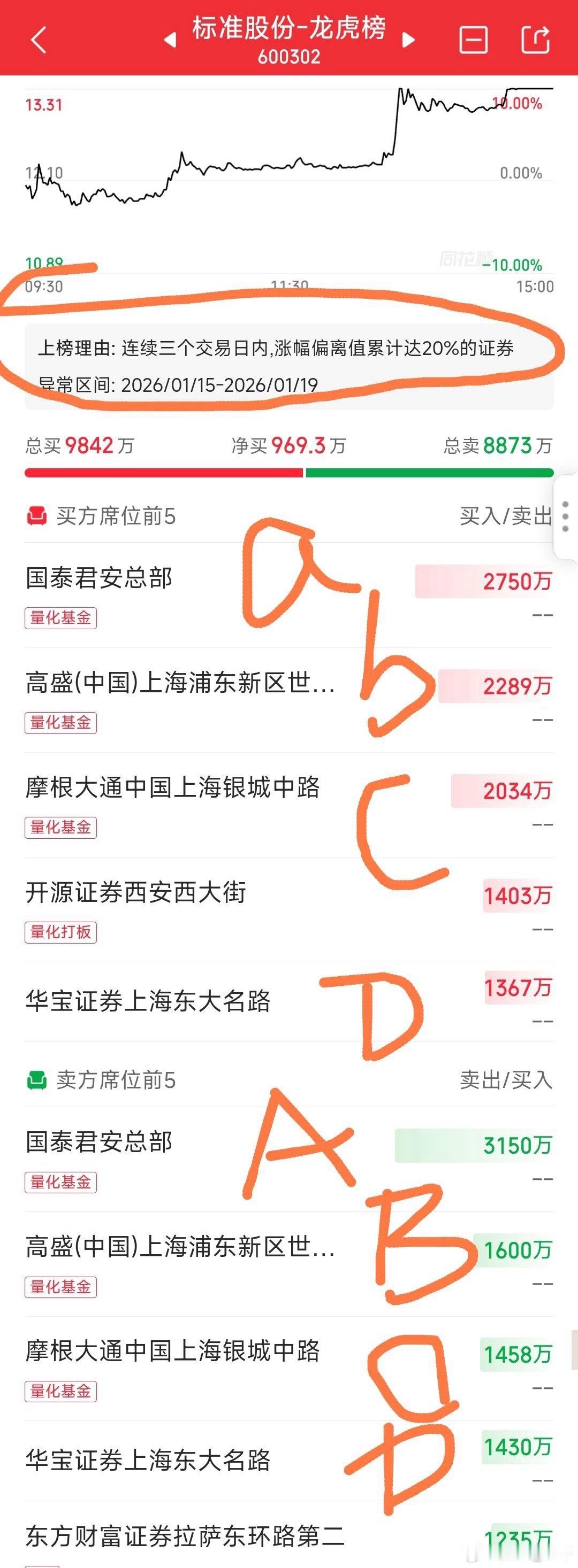 我说的就是标准股份的龙虎榜,三天的卖买,有进有出。从榜上看真正进入的仅一只开源西安西大街量化,但若仅此一家。今天上午的回就是为砸盘吸筹,为再拉升做T作准备,现虽跌6.5%,股价12.44元,但下午依然有望冲高飘红。我们试目以待。