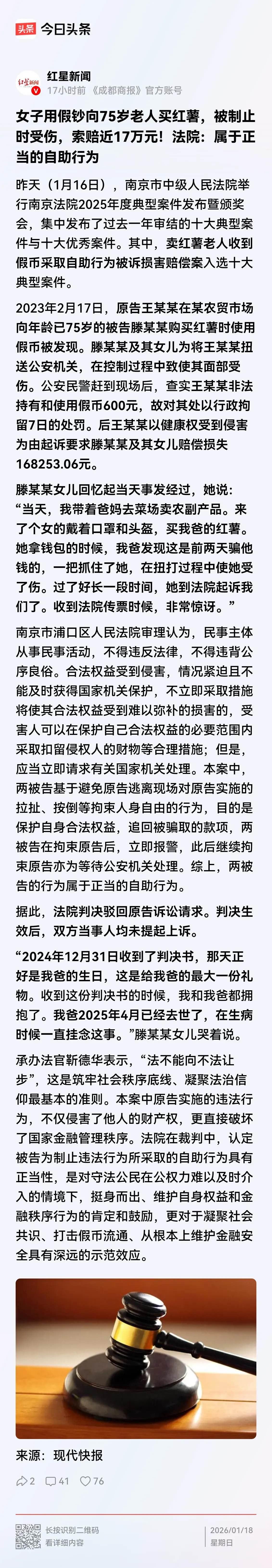 南京,75岁老人卖红薯,一女子用假币购买老人红薯。几天后,女子再次去老人摊前买红薯,被老人及其女儿认出,在把她扭送去派出所的过程中,致女子面部受伤。民警到场后,查实女子非法使用假币600元,对她拘留7日。事后,女子起诉到法院,要求卖红薯 老人赔偿医疗费和精神损失费,这事儿在小区里炸开了锅。 有人说女子活该,用假币坑老人,受伤也是自找的。 也有人觉得,扭送可以,但不能伤人,得讲分寸。 老人女儿委屈得直掉泪,说当时太气愤,没控制住力道。 老人坐在摊前唉声叹气,卖红薯挣点辛苦钱,还惹上官司。 邻居们都来给老人打气,说不能让坏人得逞,愿意出庭作证。 女子却坚持自己受伤有理,认为对方动手就该赔偿。 法院开庭时,双方各执一词,争论得面红耳赤。 大家都在等判决结果,想看看这事儿到底该怎么了断。