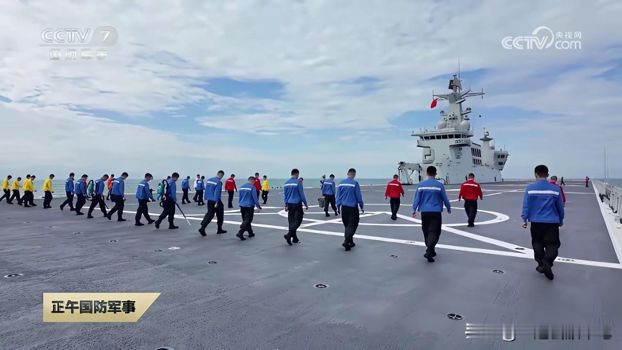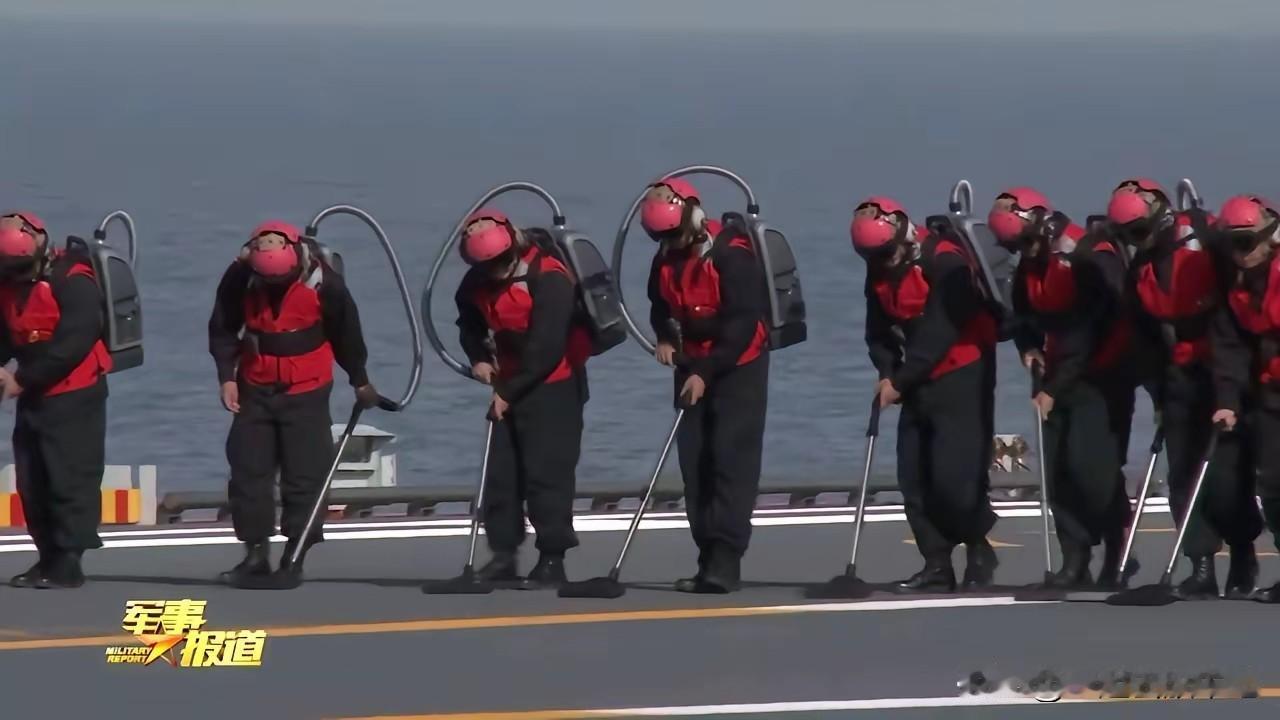 什么是先进! 看看中国军舰的甲板是怎么清理的,每个人背着类似吸尘器的装备,排成一队,这样用设备清理甲板,效率高,没有死角。 军舰甲板一些细小的东西,对于飞机来说,有可能是致命的,军舰甲板的清洁工作尤其重要,过去完全靠肉眼,但是细小的东西不容易被发现,用设备清洁,可以做到高效、快捷。