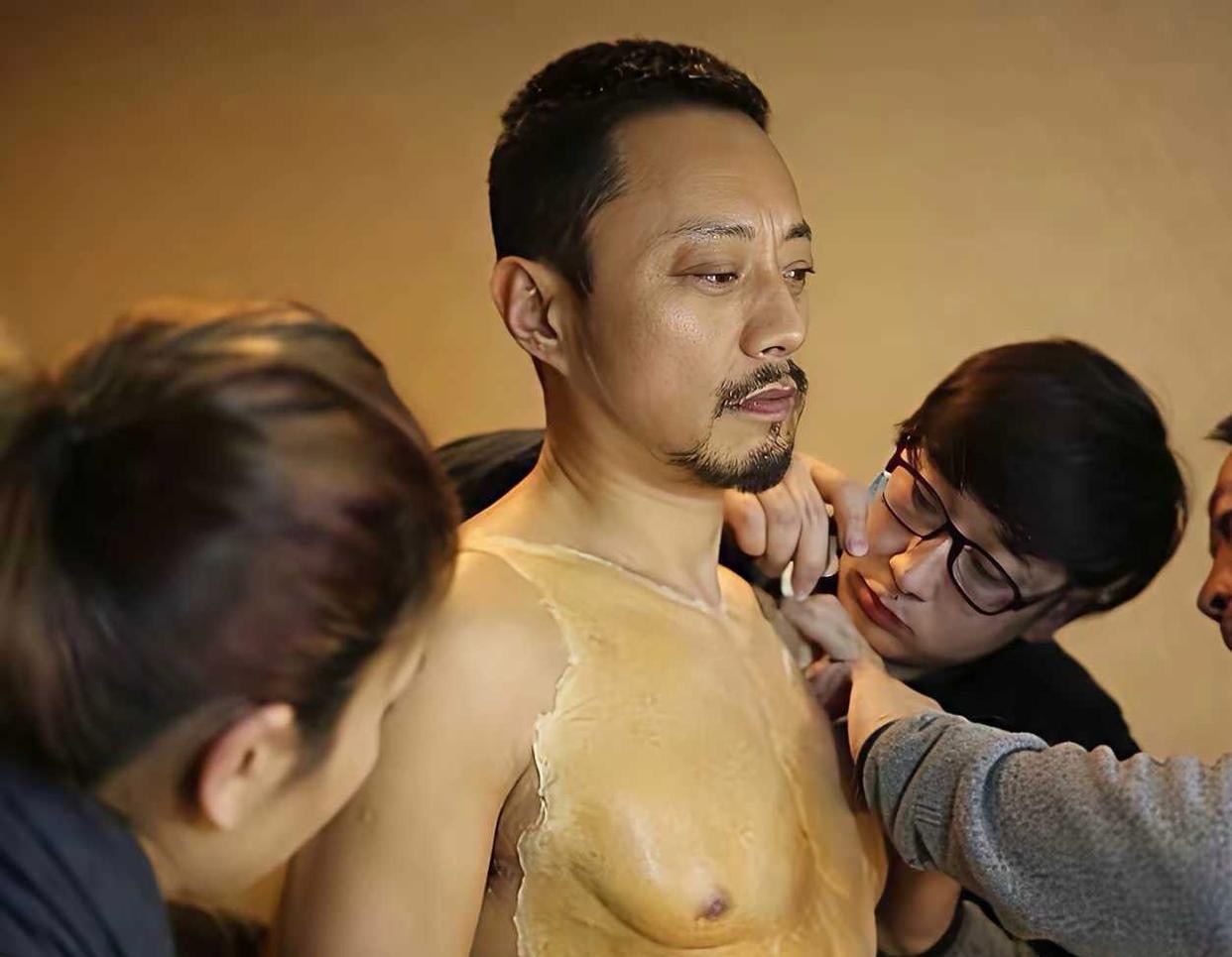 张涵予曾经真是对自己太不自信,为了拍戏戴假胸肌,腹肌。那时候真的以假乱真,因为张涵予一直都是硬汉,型男的感觉。