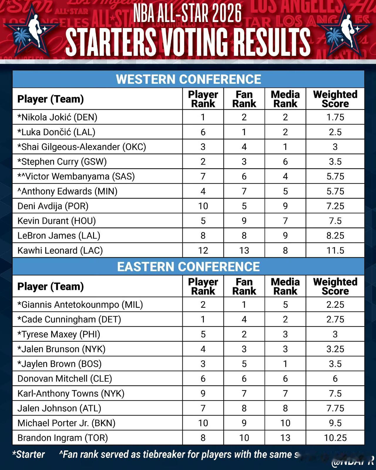 东契奇也太不受联盟球员待见了吧! 今天的全明星投票结果已经出炉,湖人队球星东契奇当选球迷投票票王,这是他职业生涯首次获得这项荣誉。不过,虽然东契奇球迷投票高居第一,但他却是以第二名的身份入选的首发阵容,因为他的球员投票仅仅排名西部第六位,媒体投票也不如约基奇,最终的综合得分为2.5分,排名西部第二位。约基奇的球迷票数排名西部第二,但他的球员投票高居西部第一,媒体投票与东契奇并列第一,综合得分为1.75分,反超东契奇排名西部第一位。 作为联盟实力与人气兼具的超级球星,东契奇似乎在联盟球员中并没有那么受欢迎,这也是他综合排名最终被约基奇反超的根本原因,球员得票数这项太拉后腿了。