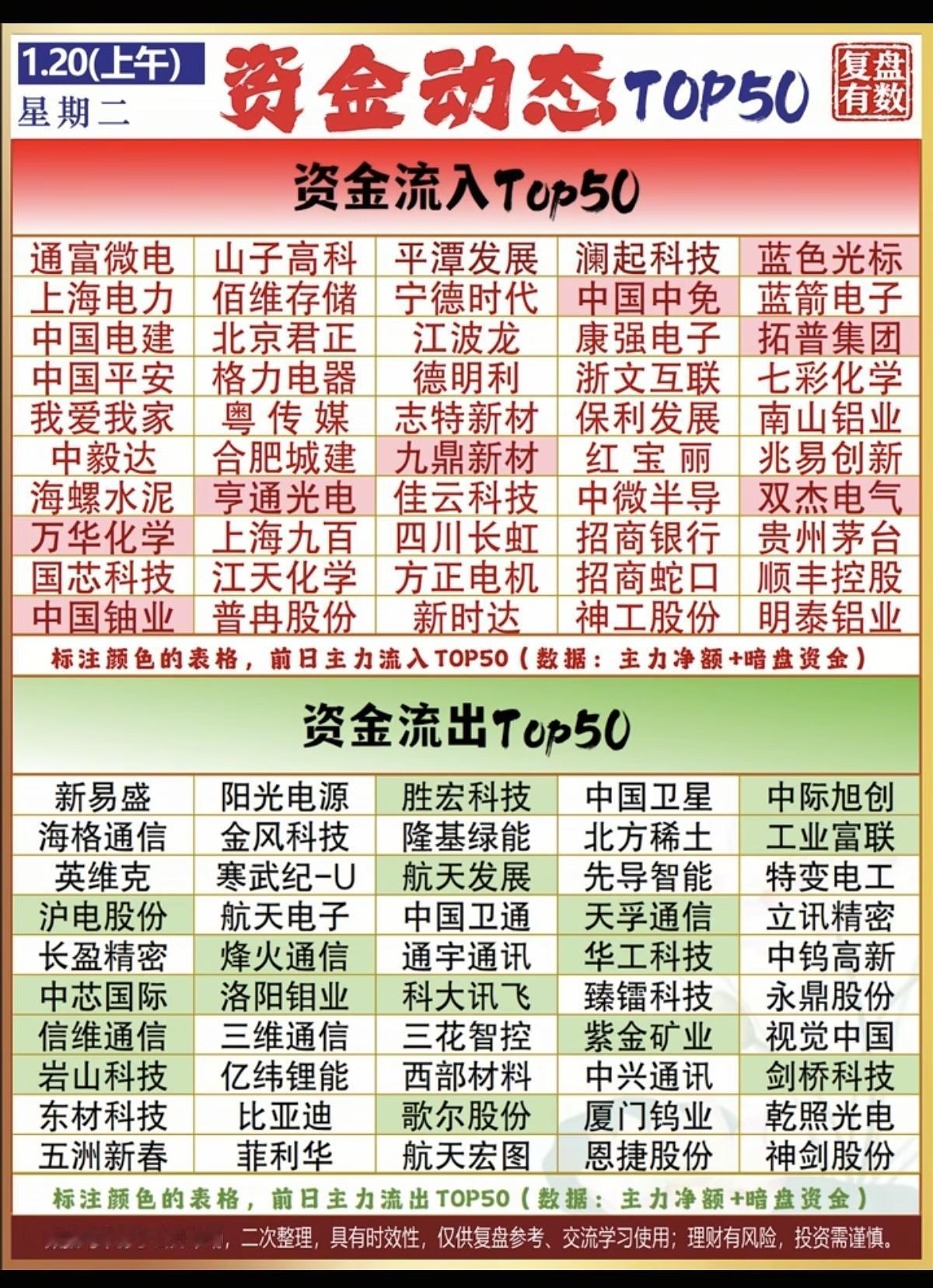 1.20周二 主力大资金 抢筹出逃个股榜! 资金流入: 美容护理,文化传媒,水泥建材,房地产板块等资金流入明显 资金流出: 通信设备,小金属,电源设备,航天航空,电池相关等板块资金流出