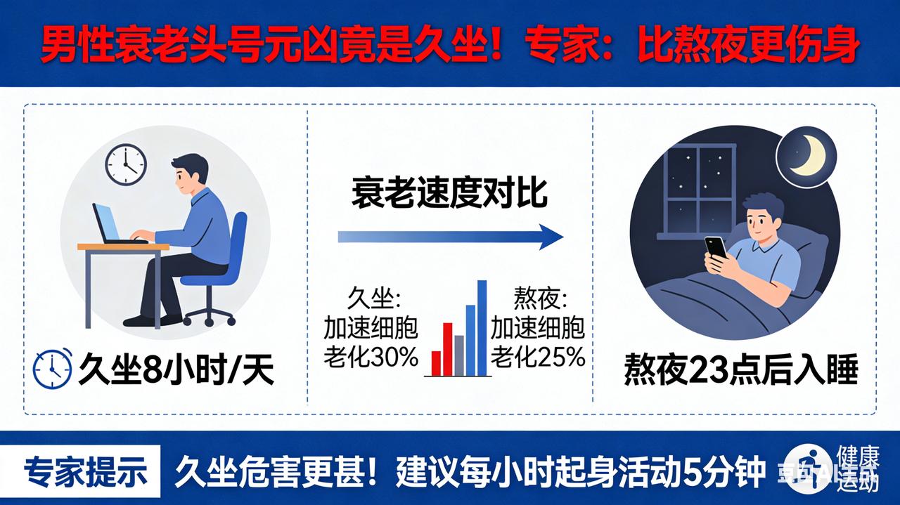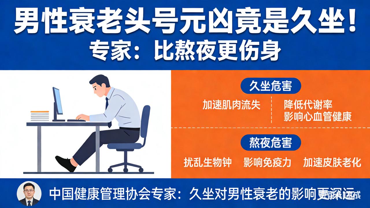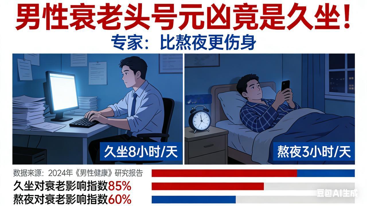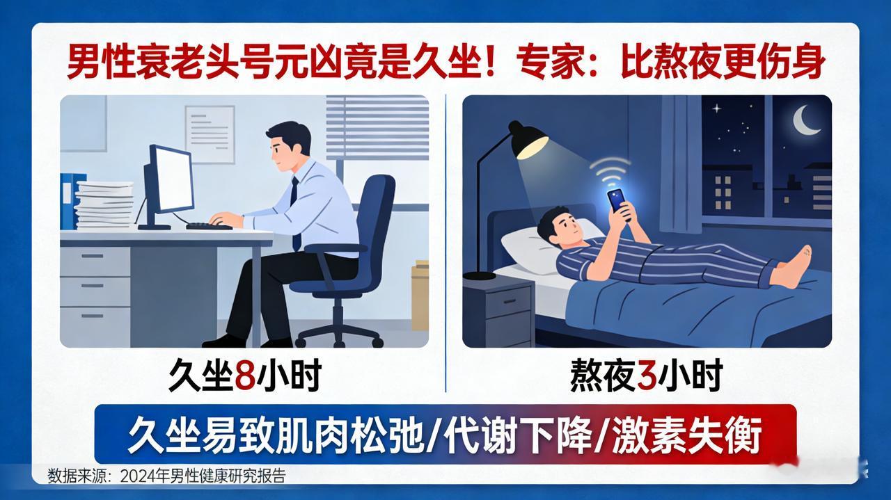 男性衰老头号元凶竟是久坐!专家:比熬夜更伤身 男性“断崖式衰老”元凶揭晓:熬夜仅排第5,榜首竟是它,无数人还在“硬扛”! 别再把“显老”全怪罪于熬夜加班了!一项基于男性荷尔蒙与细胞衰老的深度解剖研究,揭开了一份残酷的“男性衰老加速器”排行榜。令人震惊的是,熬夜竟只屈居第5位,而真正的“时光杀手锏”,正是绝大多数男性引以为傲却深受其害的——长期情绪内耗与死扛压力。 第5名:长期睡眠不足 缺乏深度睡眠会让生长激素停摆,身体修复机制瘫痪。但这只是“基础伤害”,并非致命核心。 第2-4名:烟酒轰炸与高糖重油 烟草收缩血管、酒精毒害肝脏、高糖引发“糖化反应”让皮肤焦黄松弛。这些是显性的“外貌杀手”,顶多让你看起来比同龄人老5岁。 第1名:情绪“高压锅”(隐性核爆) 这才是真正的“衰老之王”。医学解剖发现,长期压抑怒火、焦虑或为了“面子”死扛压力的男性,体内皮质醇(压力激素)水平常年爆表。它像一把隐形的刀,在细胞层面发起三重攻击: 1. 斩断寿命:直接缩短染色体端粒,让细胞提前死亡; 2. 扼杀雄风:抑制睾酮分泌,导致肌肉流失、性功能断崖式下跌; 3. 引爆炎症:诱发全身慢性炎症,让血管硬化提前20年。 真实写照: 看看那些40岁就发际线后移、啤酒肚高耸、眼神浑浊的中年男性,他们往往不是因为累,而是因为“心累”。把情绪当垃圾扔掉,才是最好的抗衰药。哪怕大哭一场、跑一次步,也比把压力憋在心里强。别等到身体垮了才明白:情绪管理,才是男人最贵的保健品!