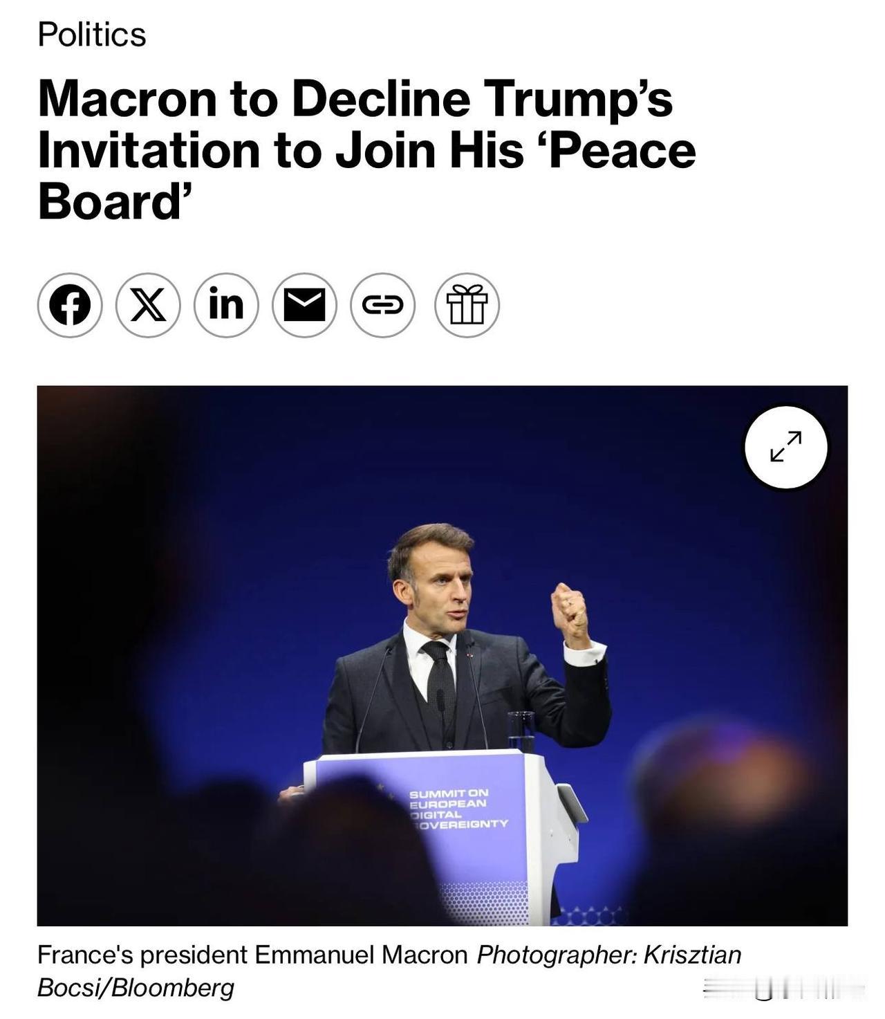 小马哥受邀了,但就是不加入加沙和平委员会,并批评该组织不限于加沙,是不尊重联合国原则及其体制框架 来源:彭博社