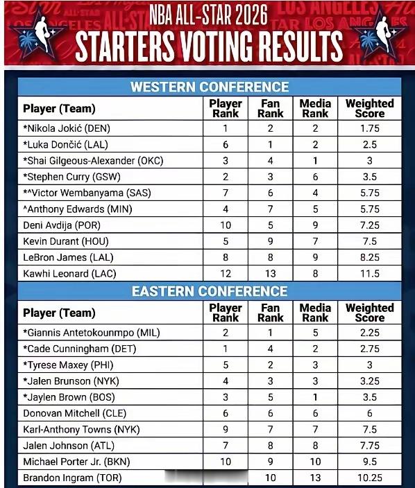 库里280万票!入选2026 NBA全明星西部首发,詹杜落选!库里在西部球员投票中,球迷投票第3,球员投票第2,媒体投票第6,加权综合排名西部第4。难能可贵的是球员投票中高居西部第二,仅次于约基奇,说明库里获得了同行球员的高度认可。毕竟打球的人才是最懂球的!球迷有自己的喜欢,媒体有一定倾向性,但球员都是心高气傲的,不是打心底里服气,别人不会随便投你。球员得分的权重分配为球迷投票占50%、球员投票占25%、媒体投票占25%nbanba全明星库里詹姆斯