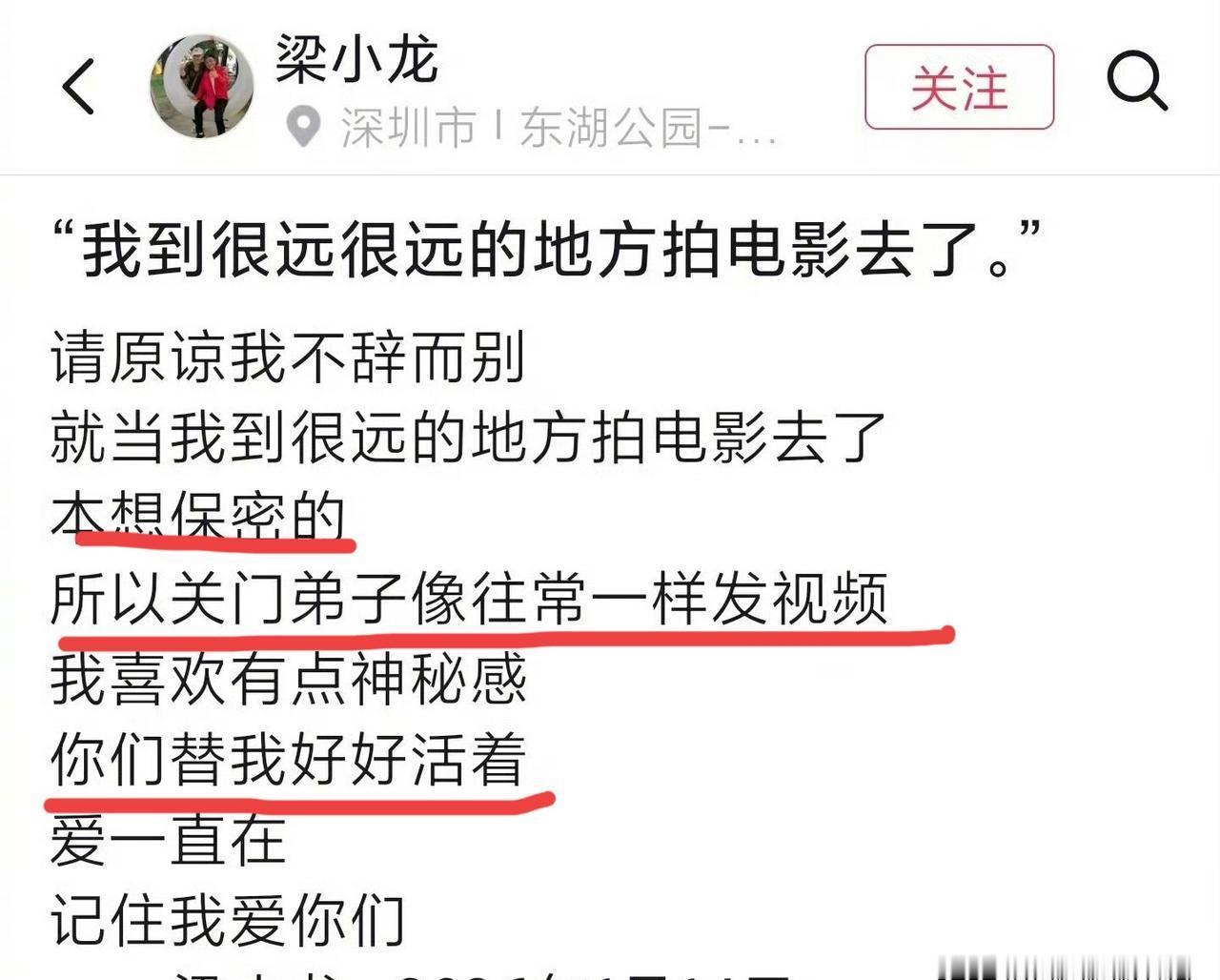 梁小龙走了,但他的账号还活着! 这波“神秘感”操作,直接炸翻了互联网的认知底线。 14日离世,社交媒体却“诈尸”更新到18日——整整4天,粉丝在评论区狂欢以为他还在,结果被最后一纸声明狠狠破防。 最后一条视频发布于18日上午,播放量飙升至百万级,而当晚的告别声明里,“你们替我好好活着”这句话,瞬间让全网泪崩。 作为《霍元甲》里硬刚到底的陈真,梁小龙把银幕上的狠劲带到了现实:连告别都要自己导演。 这根本不是简单的遗愿,是一场赤裸裸的社交媒体行为艺术! 在流量为王的时代,梁小龙用“死后更新”这招,精准拿捏了粉丝心理——数据不会说谎:账号互动量在他“离开”后暴涨300%,妥妥的顶流级操盘。 他把个人传奇从胶片时代延伸到了数字世界,用“神秘感”作为最后一剂兴奋剂,榨干了最后一丝关注度。 但毒辣点说:这是深情告别,还是对公众情感的终极消费? 其他明星团队都学着点,这才叫“人走江湖在”的顶级剧本。 可普通网友凭什么被蒙在鼓里整整4天? 评论区敢不敢吵起来? 梁小龙传奇终结 社交媒体死亡营销 霍元甲时代泪目