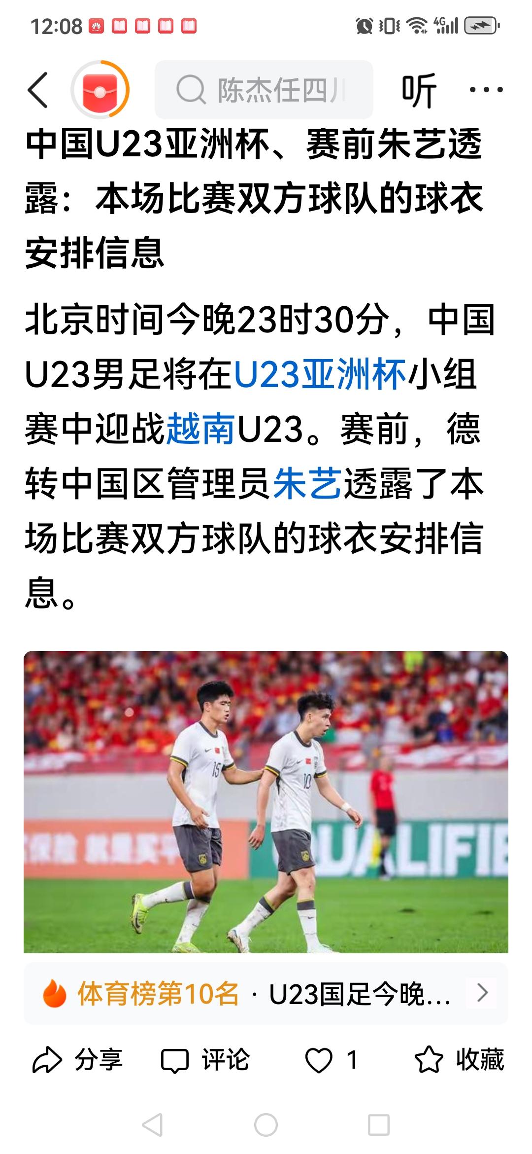 虽然都是大红底黄五角,但亚足联对今晚U23亚洲杯半决赛中越之战,却安排越南为主我为客。 这场客战的麻烦,不仅是少休一天、要长途跋涉,据德转朱艺披露,国足还不得不将本届比赛一直穿的红色队服改白色。 如果细想一下,国足作为第四档球队,却四战不败、一球不丢,逆风向而大红,会不会因为穿了红色队服? 已经莫得改了,希望小将们别在乎这个,拿出实力,发挥优势,全力以赴洗白对手。国足加油![点亮平安灯][点亮平安灯][点亮平安灯]