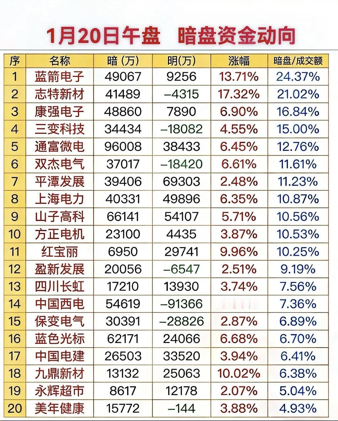 1月20日午盘暗盘资金动向分析 科技股午后表现活跃,蓝箭电子领涨,多只个股成交