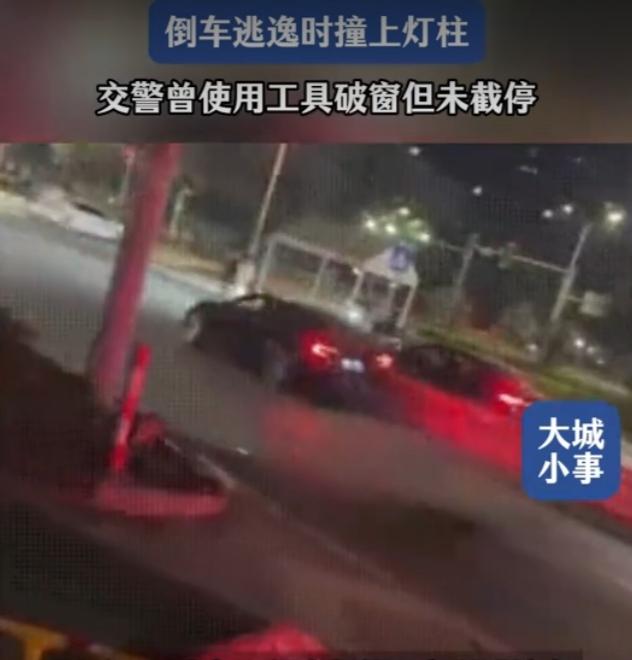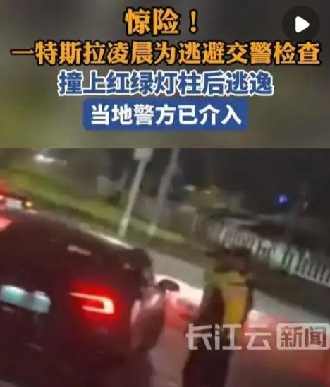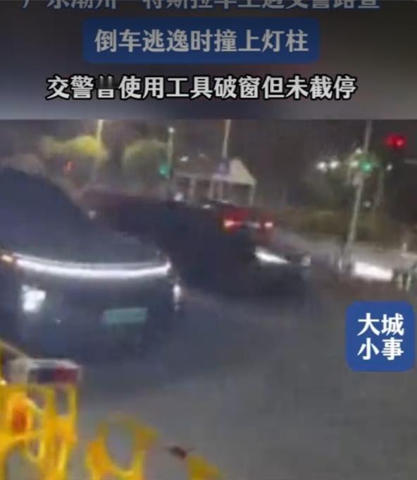 广东一特斯拉撞上红绿灯柱后逃逸,交警上前拦截,涉事司机反而加速掉头驶离现场,当地