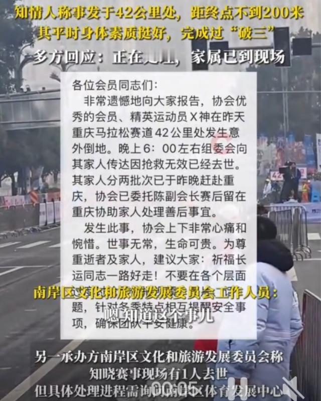 重庆马拉松一选手倒地疑去世,知情人:事发42公里处,其平时身体素质挺好;多方回应 看着视频里42公里标志牌下医护人员紧急施救的身影,谁能想到倒下的是位能“破三”的马拉松精英?一个平时身体素质过硬、赛前还在朋友圈立志“拿下小金人”的跑者,却在距离终点仅200米的地方戛然而止,这场发生在重庆马拉松的悲剧,让无数人扼腕叹息的同时,更戳中了所有运动爱好者的痛点:我们追求极限,到底该如何平衡热爱与安全? 据知情人透露,这位来自湖北孝感的钟姓选手,是当地马拉松协会的优秀会员,能在全程马拉松中跑进3小时的“破三”成绩,足以证明其训练的专业度和身体底子 。可就是这样一位经验丰富的跑者,却在最接近胜利的时刻突发意外。现场视频显示,他倒地后医护人员第一时间开展心肺复苏,但最终未能挽回生命,家人连夜分批赶赴重庆处理善后,协会也委托专人协助事宜,群内通报里“世事无常,生命可贵”的字句,道尽了无尽惋惜。 事件发酵后,多方回应引发热议:南岸区体育发展中心确认网传消息非虚,正在进一步调查;重庆市体育局称具体事宜由执行单位负责,却出现电话无人接听的情况;赛事组委会始终未能正面回应,让公众对救援流程、赛事保障的疑问不断累积 。要知道,2025年10月中国田径协会刚发布新规,要求赛事主办方落实主体责任,细化医疗保障、建立熔断机制,可为何悲剧仍在发生? 这不禁让人想起那些相似的遗憾:珠海马拉松中退役士兵的猝然离世,苏州环金鸡湖马拉松上25岁女选手的倒下,这些案例里的逝者大多平时身体康健,却都在极限运动中遭遇意外 。医学专家早已明确,运动性猝死多与潜在心脑血管问题、过度负荷、电解质紊乱相关,即便没有基础病史,赛前疲劳、感冒未愈或冲刺时情绪激动,都可能成为压垮身体的最后一根稻草 。而马拉松的42公里处,正是人体耐力的临界点,此时肌肉疲劳、脱水明显,任何一丝侥幸都可能酿成大祸。 网友的评论戳中人心:“不是跑得快就安全,敬畏身体比追求成绩更重要”“赛事保障不能只停留在纸面,医疗点密度、急救响应速度都得跟上”。这场悲剧不是要否定运动的意义,恰恰是在提醒每一个人:健身的初衷是健康,而非用生命赌极限。对于跑者而言,赛前全面体检、不抱病参赛、学会在不适时放弃,才是对自己负责;对于赛事方来说,落实新规要求,把医疗保障做细做实,让“安全完赛”比“更快更强”更先被铭记,才是对生命的敬畏。 愿逝者安息,也愿这场遗憾能唤醒更多人:热爱可抵岁月漫长,但生命只有一次,唯有科学敬畏,才能让每一次奔跑都通向春暖花开。你怎么看待马拉松赛事的安全保障?欢迎在评论区分享你的观点。马拉松破三 急救医疗跑者