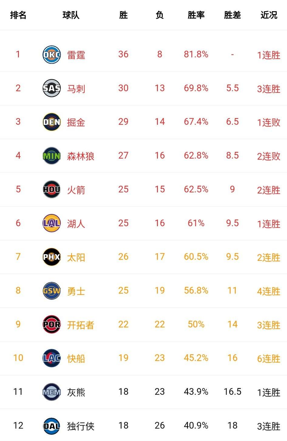西部竞争逐渐白热化,胜负随时引发连锁排名变化!雷霆最近虽然有点波动,多输了几场,但依旧稳居榜首。 马刺一波三连胜稳居第二,没有约基奇的掘金有点力不从心了,但森林狼还是无法反超。 最难的是湖人,太阳今天赢球又追平了湖人胜场,湖人明天打掘金,输球即掉入附加赛区。 勇士四连胜了,巴特勒受伤、格林轮休几乎不影响勇士了,毕竟波姐穆迪发挥越来越稳定。 伦纳德也伤了,但快船没有停止北伐,今天险胜奇才,排名重返附加赛区。