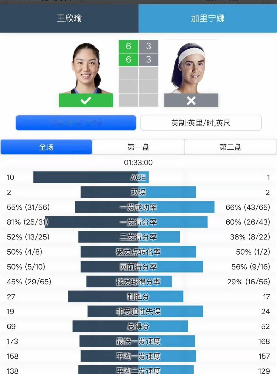 2026澳网女单首轮,王欣瑜表现太亮眼了,10个ACE,第二盘一度1-3落后,最终还是以6-3/6-3击败卡列尼娜拿下开门红,顺利晋级次轮。 这是王右第三次闯进澳网第二轮,但从来没打进过澳网第三轮,这次能突破吗? 图三是王右四大满贯战绩。